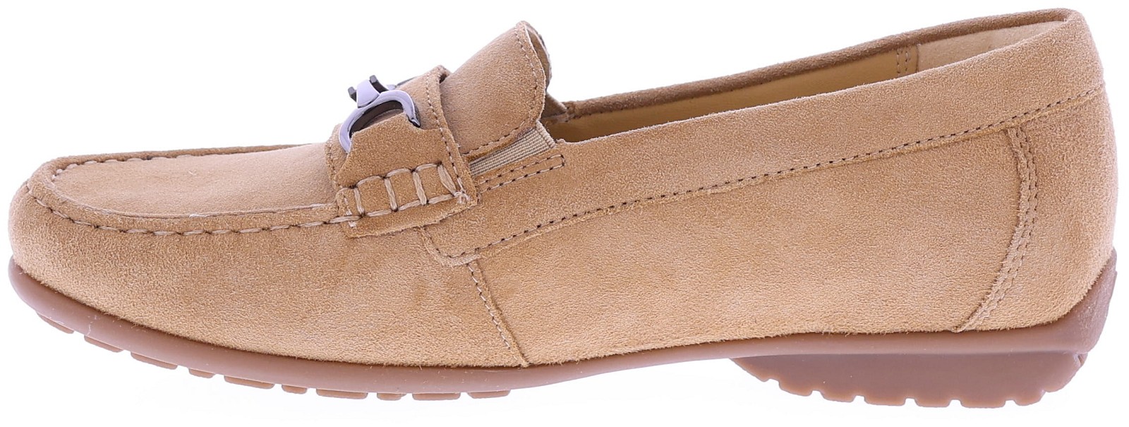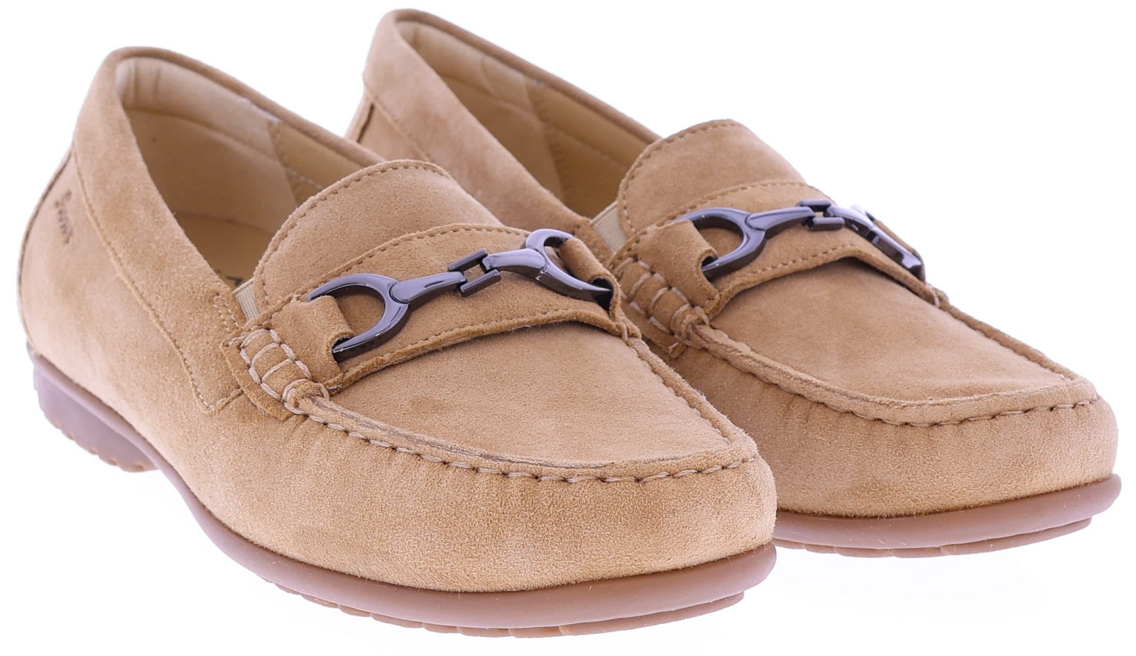 Camel kleurig suède dames instapper van Sioux model Cortizia. Deze mocassin is uitgevoerd in zacht suède en heeft een comfortabele H-breedte. De subtiele bit in donker metaal geeft de schoen een moderne, verfijnde uitstraling. Het uitneembare voetbed is perfect geschikt voor uw eigen persoonlijke inlegzool, terwijl de soepele rubberzool zorgt voor dagelijks draagcomfort. Kijk ook eens naar de andere dames instappers van Sioux bij Klijsen.
