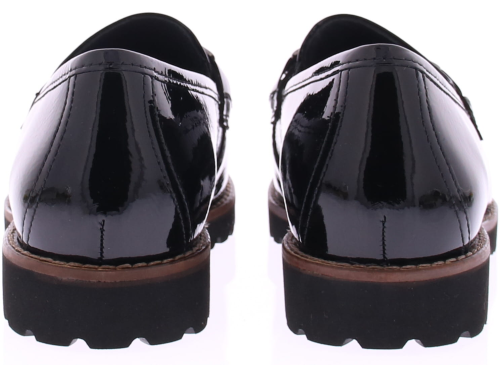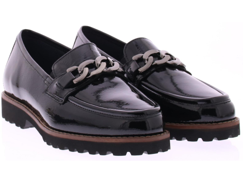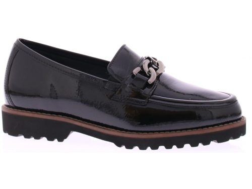 Zwarte lak leren loafer voor dames van Sioux. Deze schoen heeft een zilverkleurige bit op de wreef. De breedte van deze loafer is een H-wijdte wat inhoud dat de schoen iets breder is dan normaal. Heeft een rubberen zool met een grof profiel.