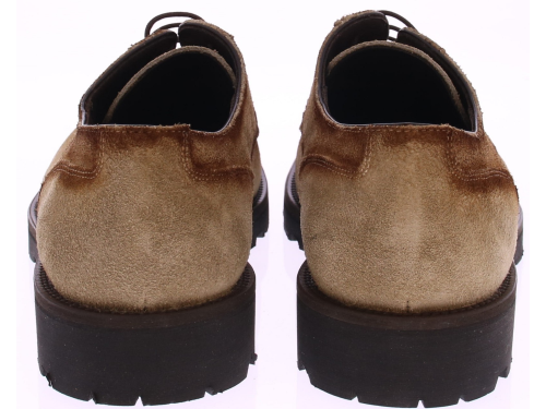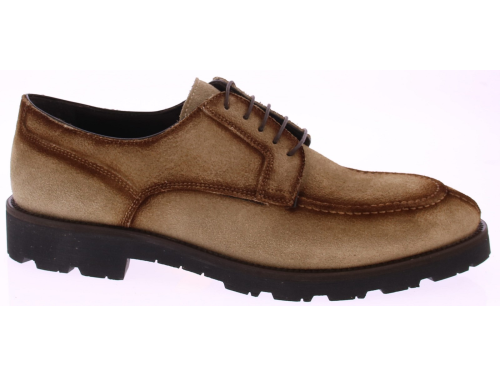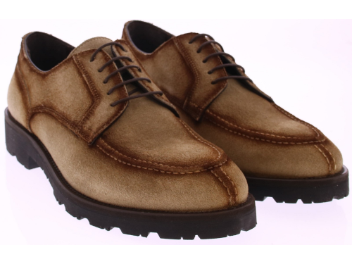 Heren veterschoen met spiegel en franse neusnaad van het italiaanse merk Spagnoletto Napoli artikel 952. Deze schoenen zijn gemaakt in beige suède en hebben een leren voering op een sportieve rubber zool van Vibram met daarin extra anti slip eilandjes voor op natte ondergrond.