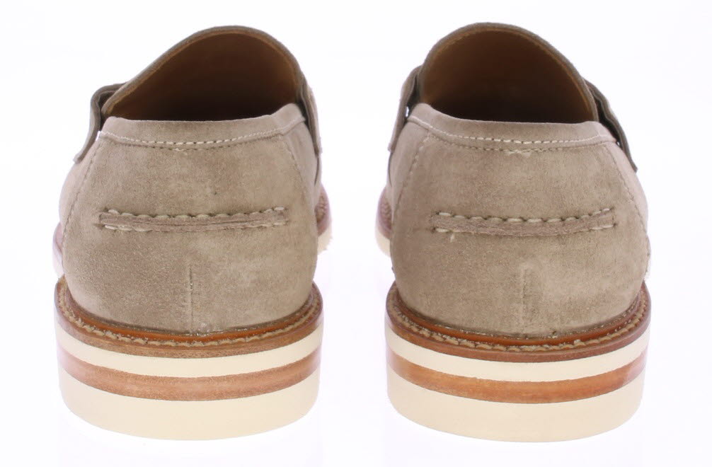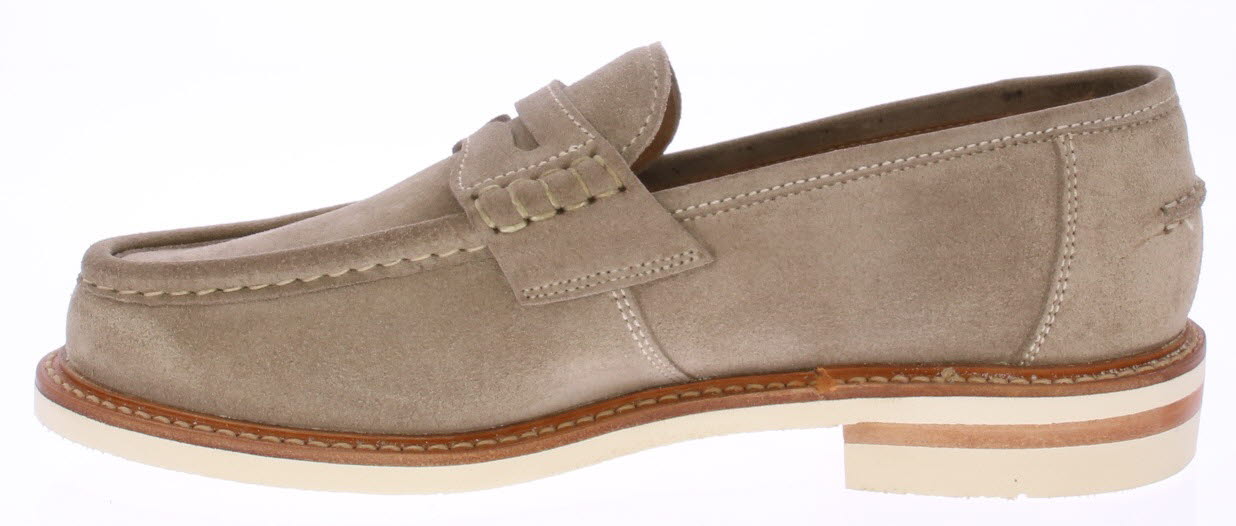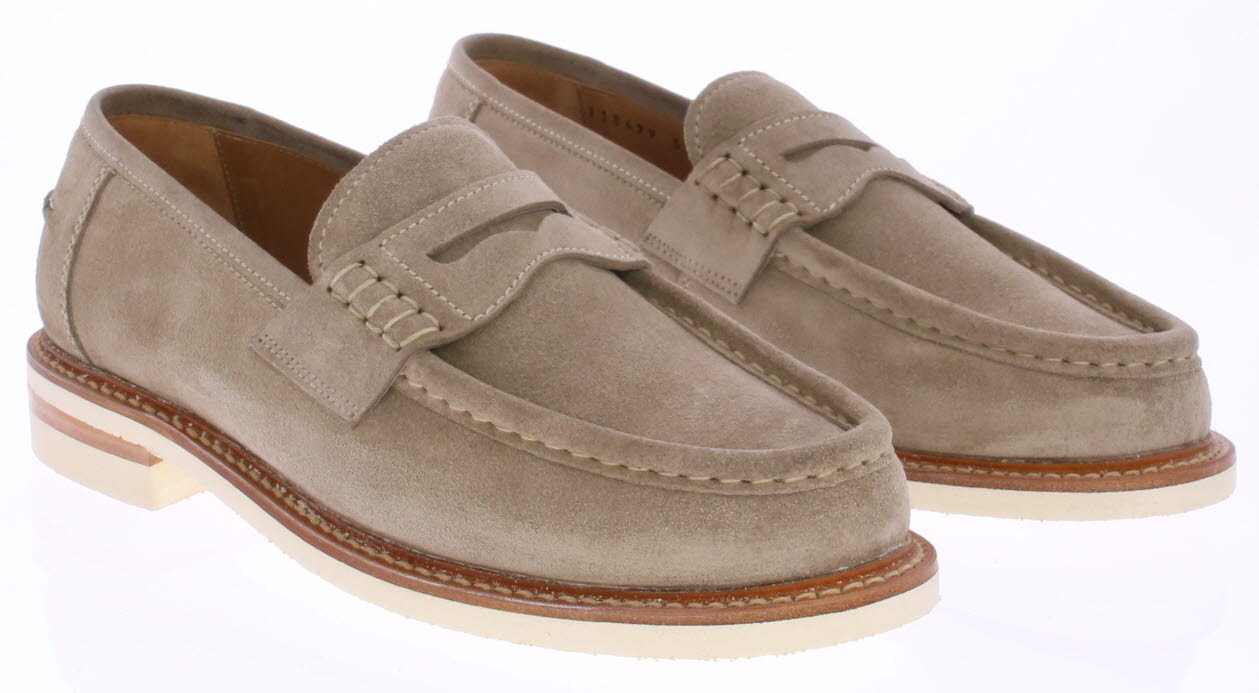 Taupe-kleurige suede heren instapper van Berwick. Deze schoen is uitgevoerd in kudo suede en heeft een witte stiknaad over het voorblad. De schoen heeft een witte rubberen zool en is leer gevoerd.