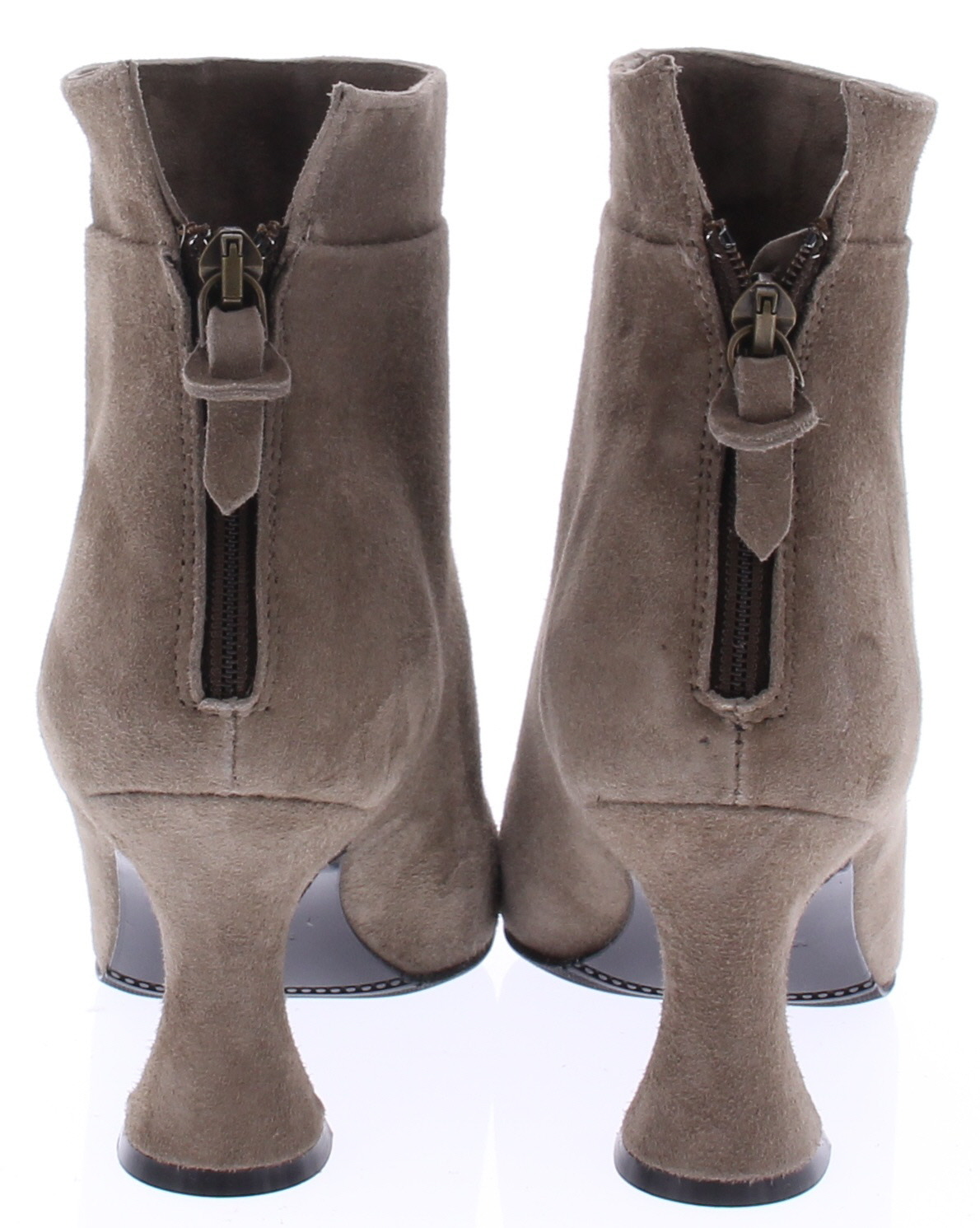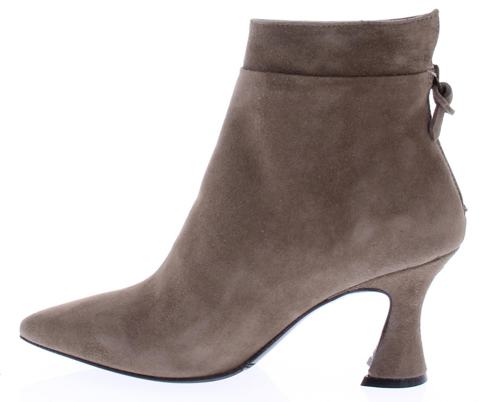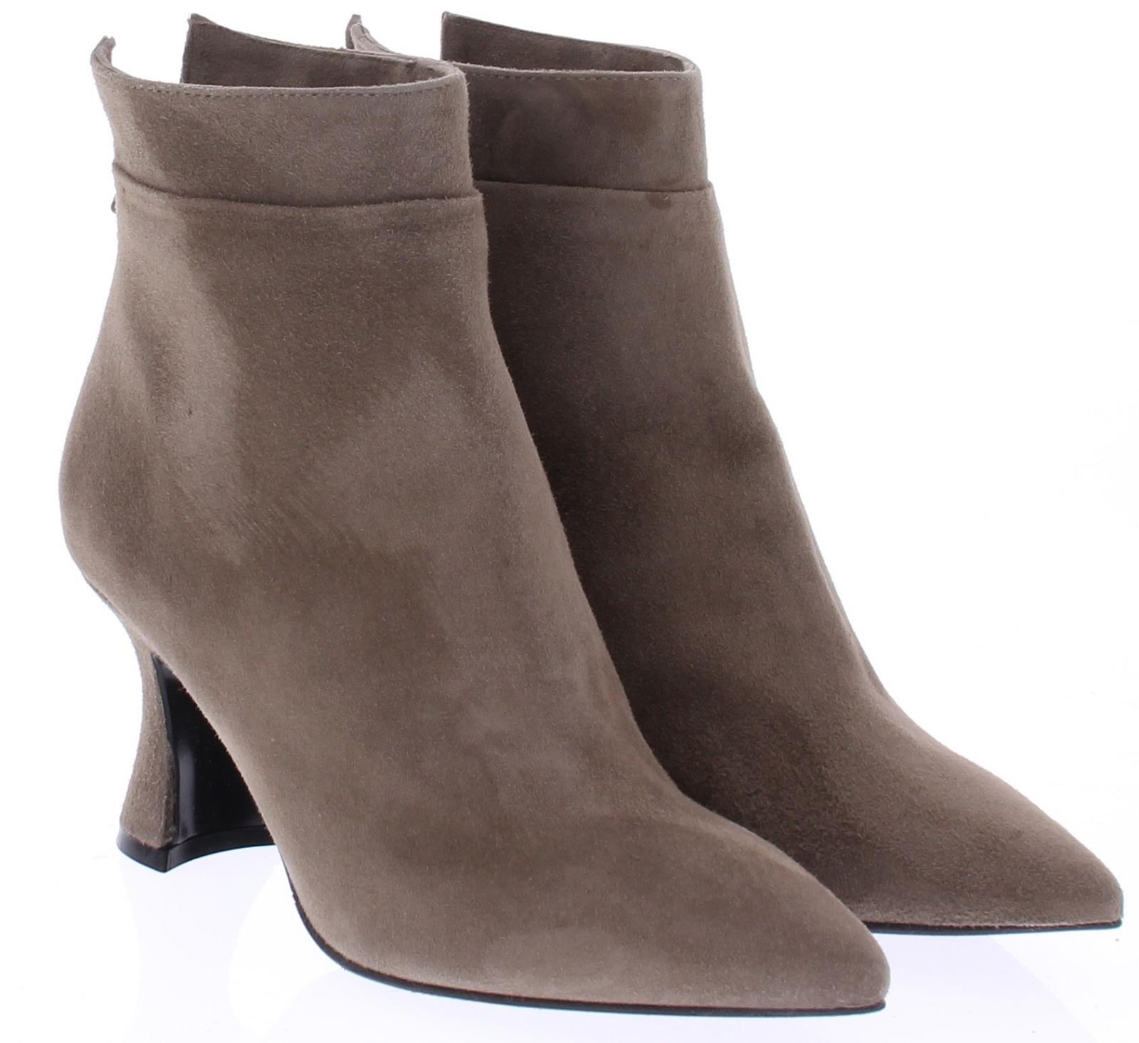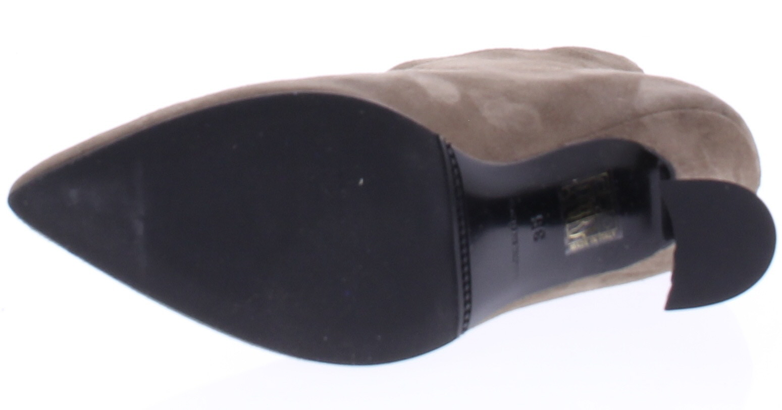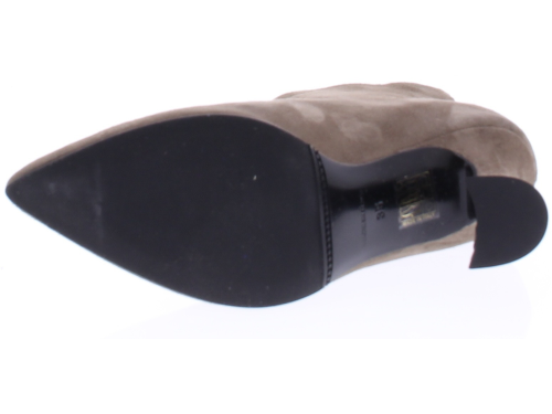 Taupe-kleurige suede dameslaars van Cypres. Het laarsje heeft een spitse neus en een rits achterop de hiel. De hakhoogte is 7 cm en is iets uitlopend.De voering is van leer en de zool van rubber. Valt wat kleiner, overweeg een halve maat groter te bestellen.