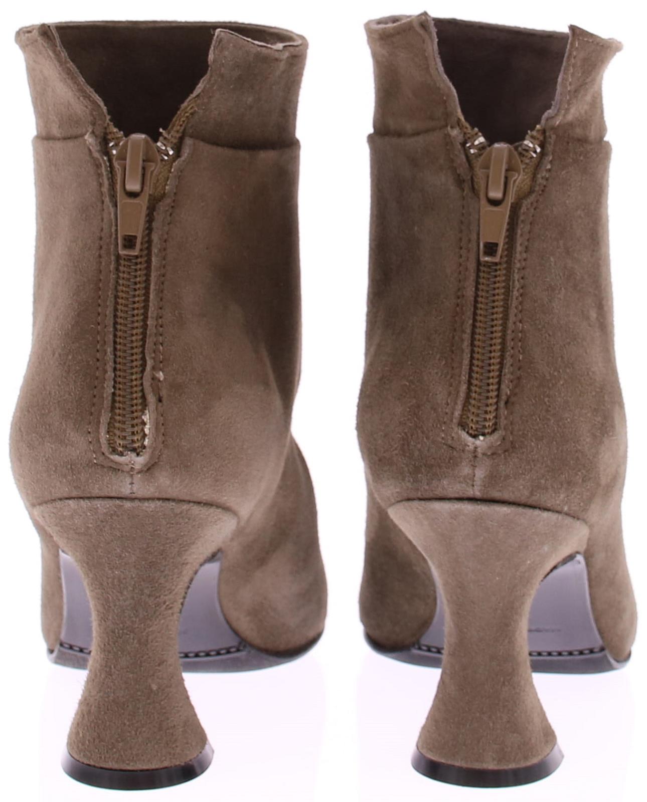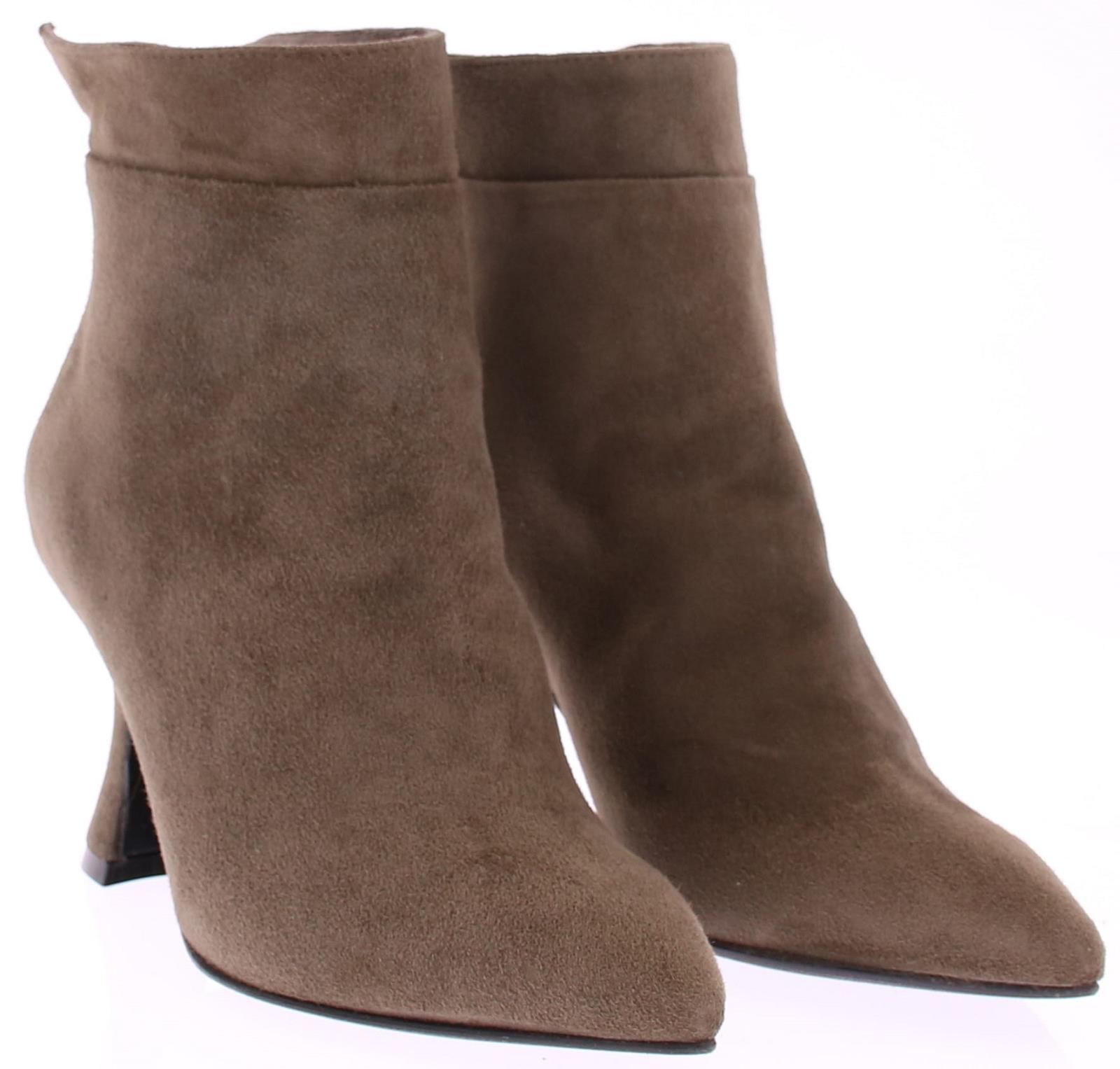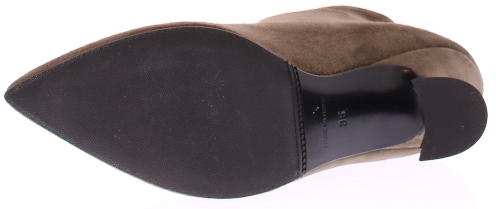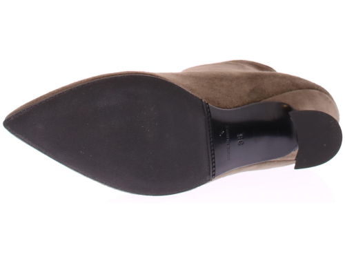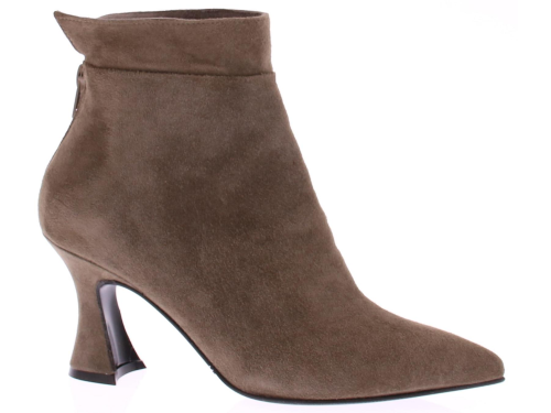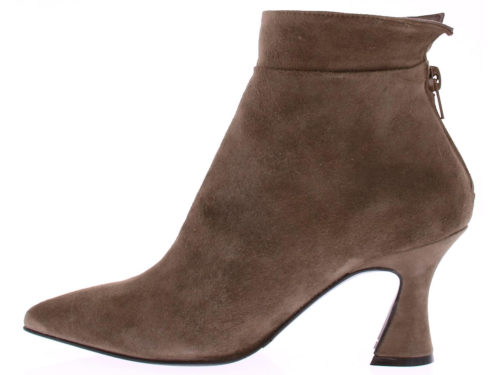 Taupe-kleurige suede dameslaars van Cypres. Het laarsje heeft een spitse neus en een rits achterop de hiel. De hakhoogte is 7 cm en is iets uitlopend. De voering is van leer en de zool van rubber. Valt wat kleiner, overweeg een halve maat groter te bestellen.|