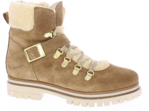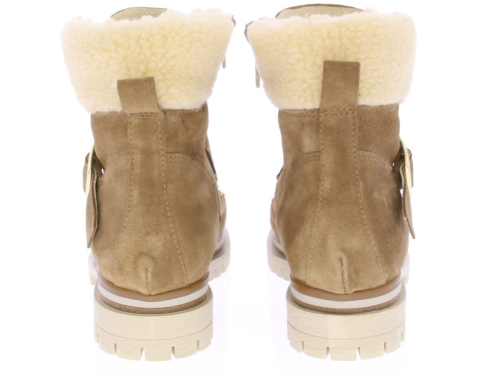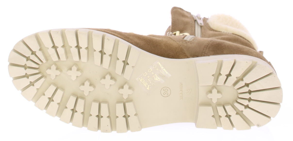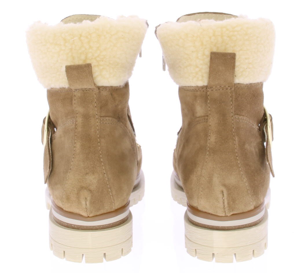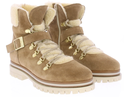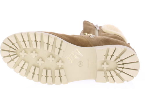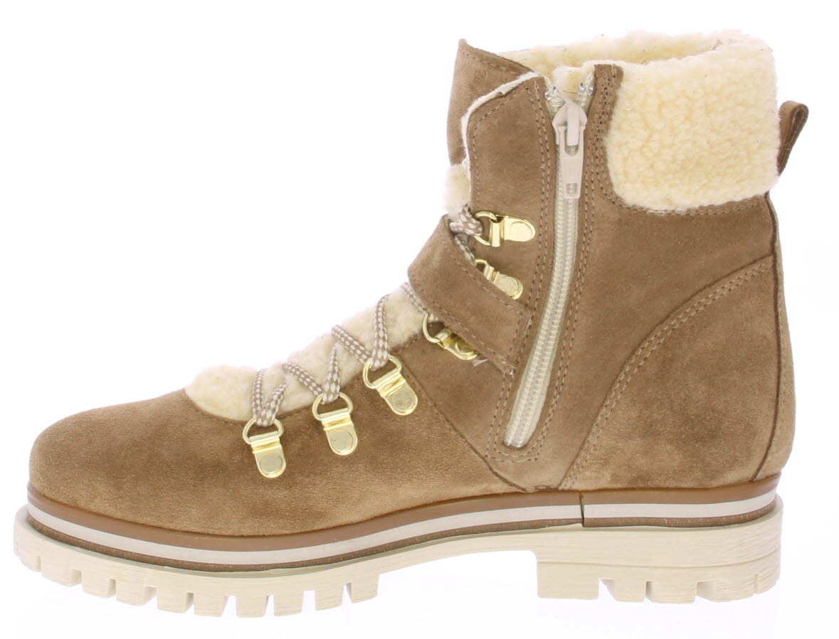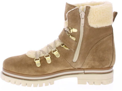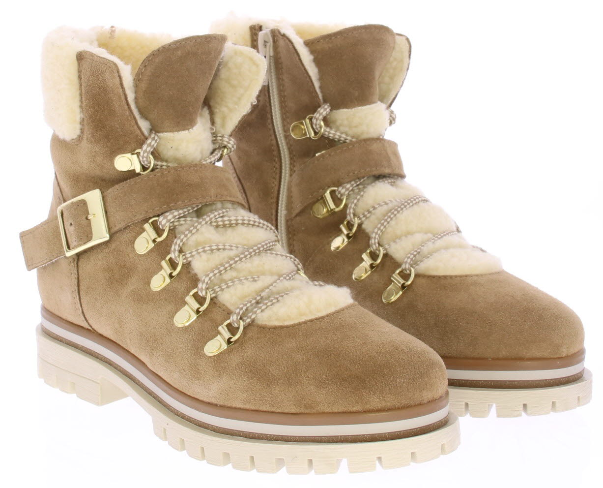 Taupe/Beige kleurige suede veterlaars van Cypres. Deze laars heeft een bergschoen vetersluiting met een gesp die schuin over de wreef loopt. Aan de zijkant van de laars zit een rits, voor een gemakkelijke instap. De voering is van vacht en de tong- en binnenzool zijn van leer.