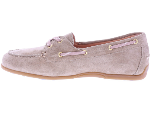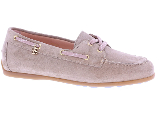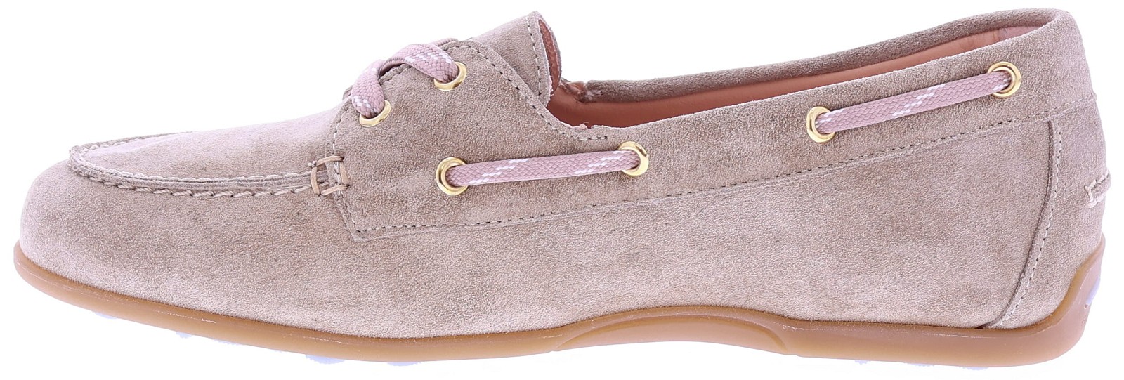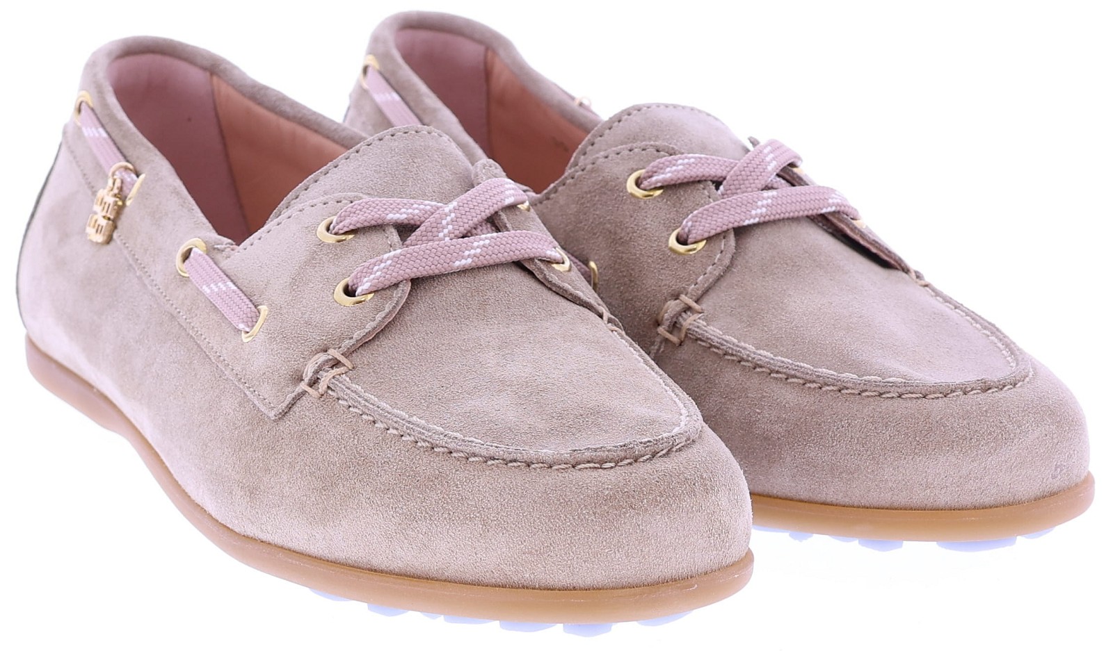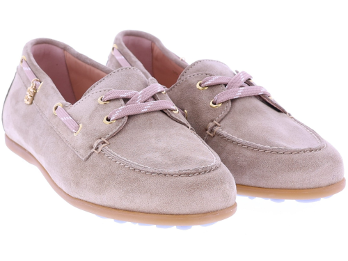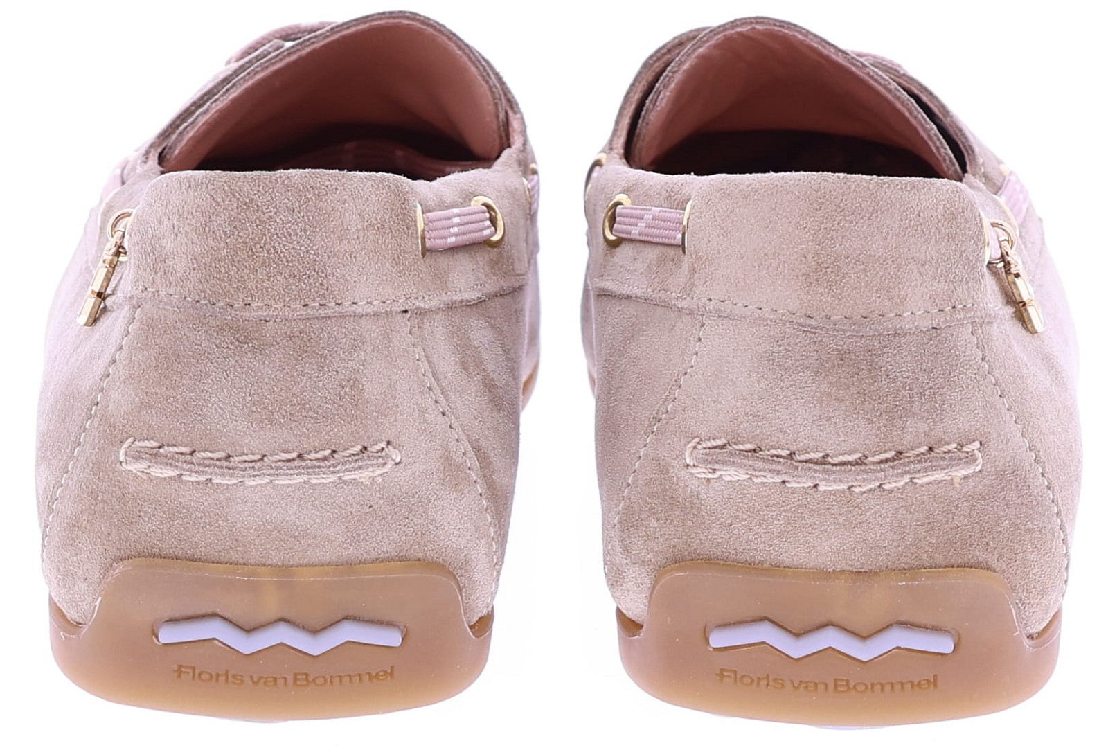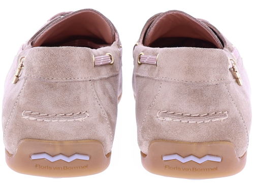 Taupe suède dames bootschoenen van Floris van Bommel. Model Bohwi 01-02 is uitgevoerd in taupe suède en heeft een sportieve uitstraling met een rondom geregen roze veter in bootschoenstijl. De slijtvaste TPU-zool loopt bij de hiel iets omhoog, met zichtbaar Floris van Bommel-logo en kenmerkende zigzaglijn. De roze leren voering en het uitneembare voetbed met foamlaag zorgen voor extra comfort. Ontdek ook de andere damesschoenen van Floris van Bommel bij Klijsen.