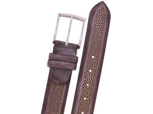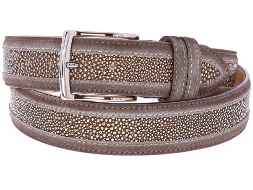 Heren riem van het merk Harris. Deze riem heeft een middenstuk van taupe roggeprint leer. De buitenzijdes zijn afgewerkt met taupe leer. De riem is in te korten aan de gespkant. Deze riem is passend bij de schoen uit onze collectie met artikelnummer 44889.