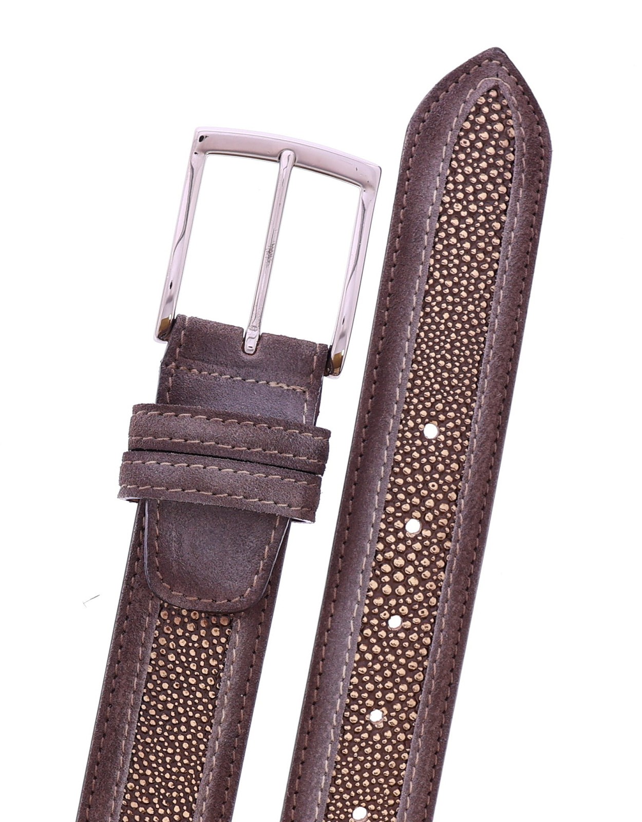 Heren riem van het merk Harris. Deze riem heeft een middenstuk van taupe roggeprint leer. De buitenzijdes zijn afgewerkt met taupe leer. De riem is in te korten aan de gespkant. Deze riem is passend bij de schoen uit onze collectie met artikelnummer 44889.