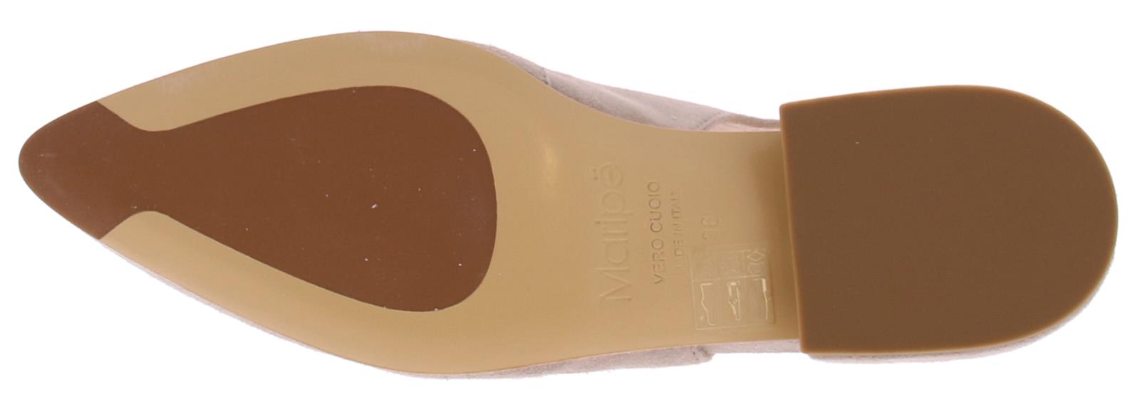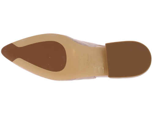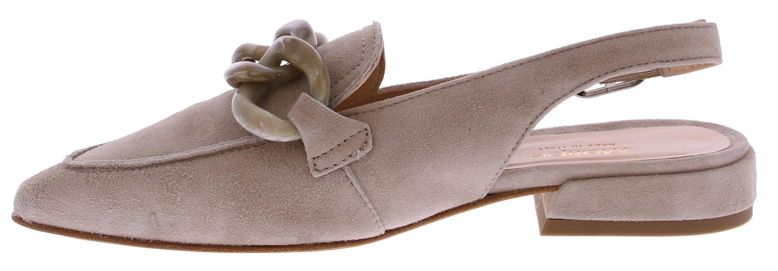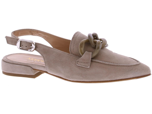 Taupekleurige suede dames slingback pump van Maripe. De pump met spitse neus heeft op de wreef een sierlijke kunstof bit in de kleur taupe. Om de hiel zit een verstelbaar bandje met een zilveren gesp. De voering is van leer en de beklede hak is 2 cm hoog.