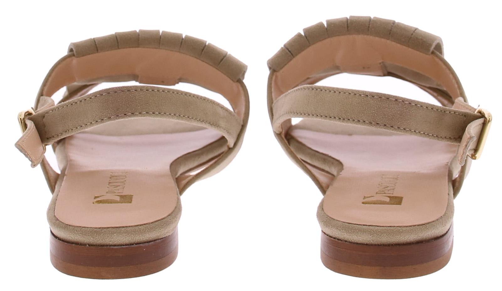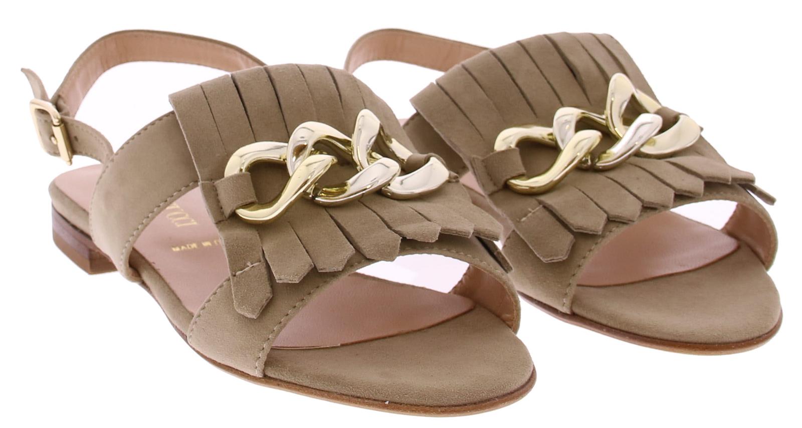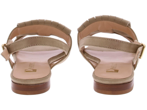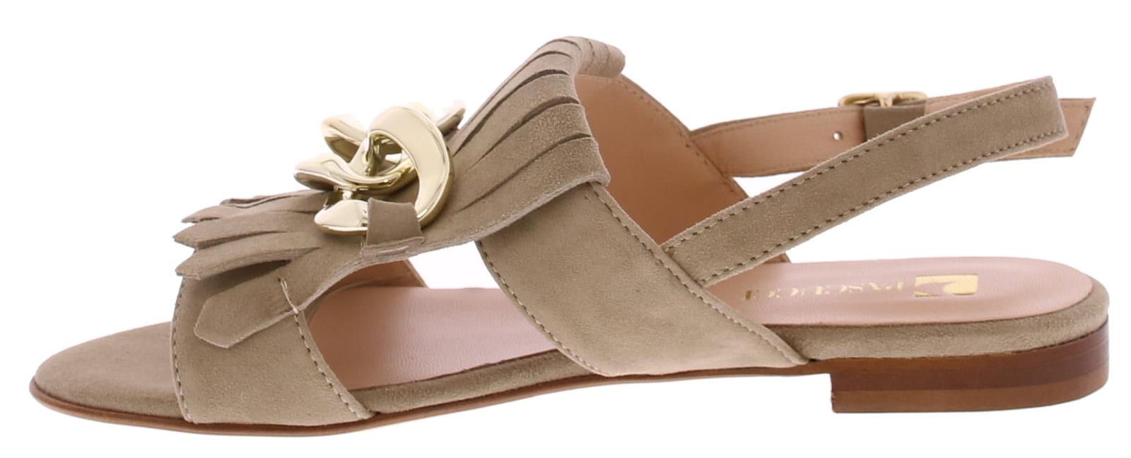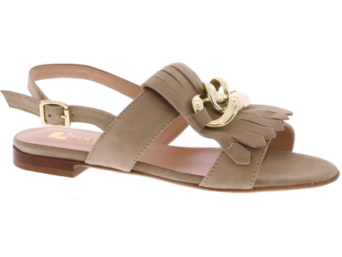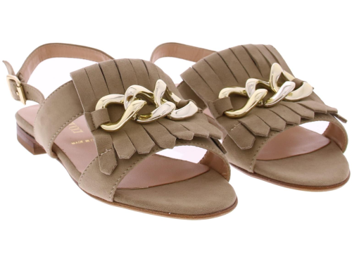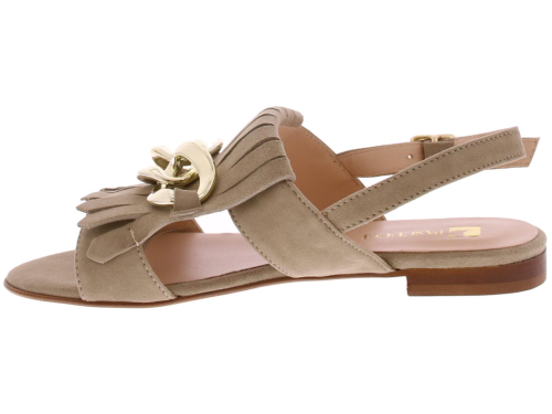 Taupe suede dames sandaal van Pascucci. Helemaal leer gevoerd en afgewerkt met een jamboreeklep op de wreef met daarop een goudkleurige ketting. Het hielbandje is verstelbaar met een goudkleurig gespje en de zool is van leer. Het voetbed is lekker soepel.