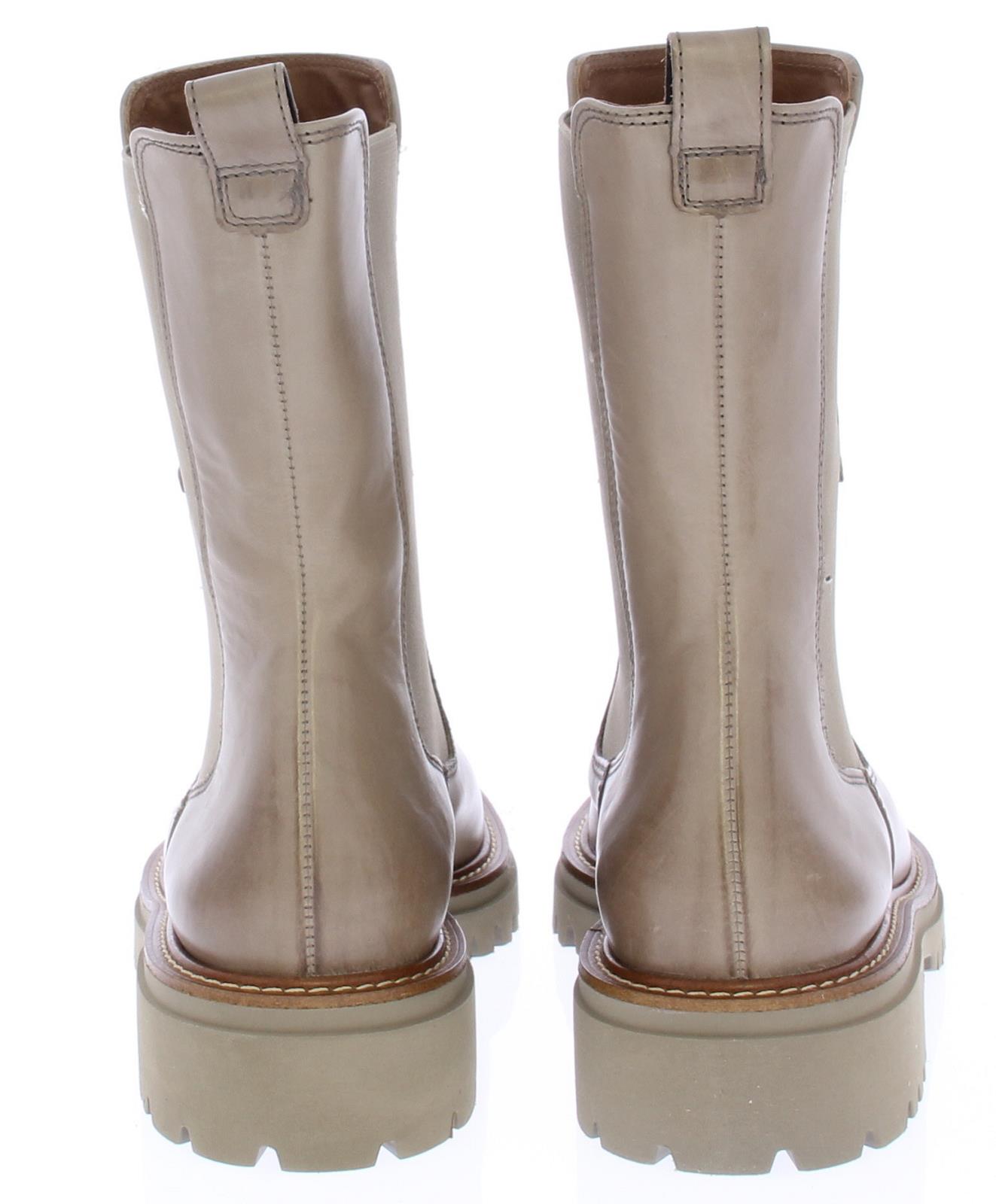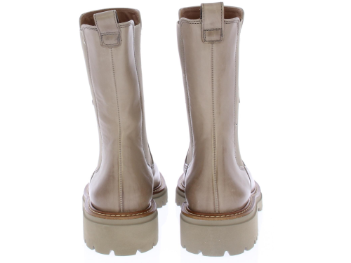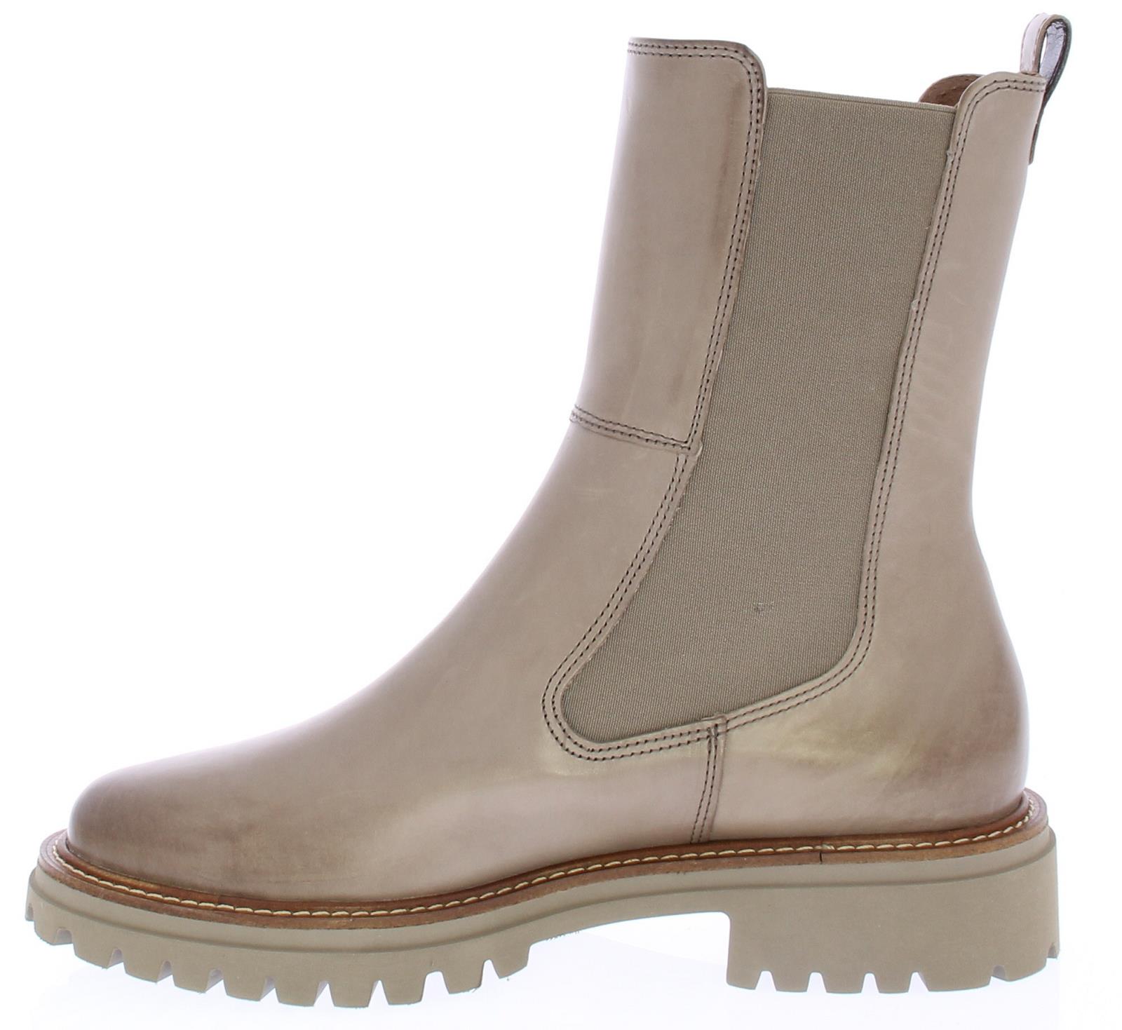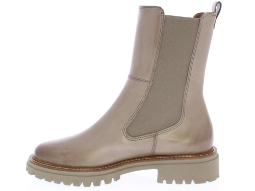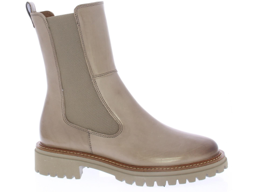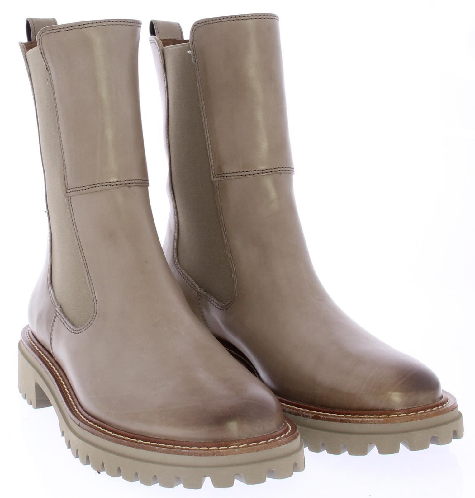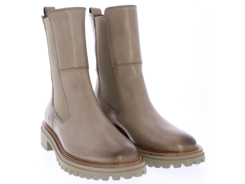 Taupe leren Chelsea dameslaars van Paul Green. De elastische zijpanelen zorgen samen met de aantreklus voor een ruime, eenvoudige instap en een prettig loopcomfort. De zoolrand heeft een bruine band met lichte stiksels. De schachthoogte is ongeveer 20 cm.