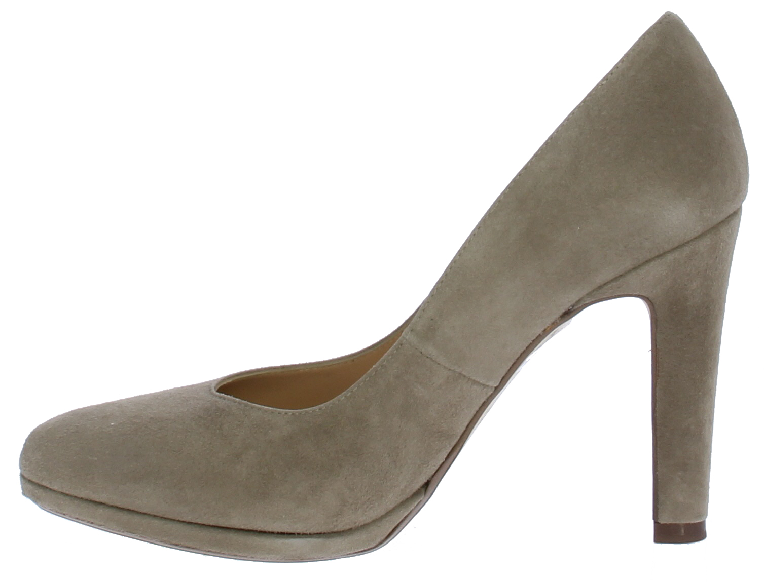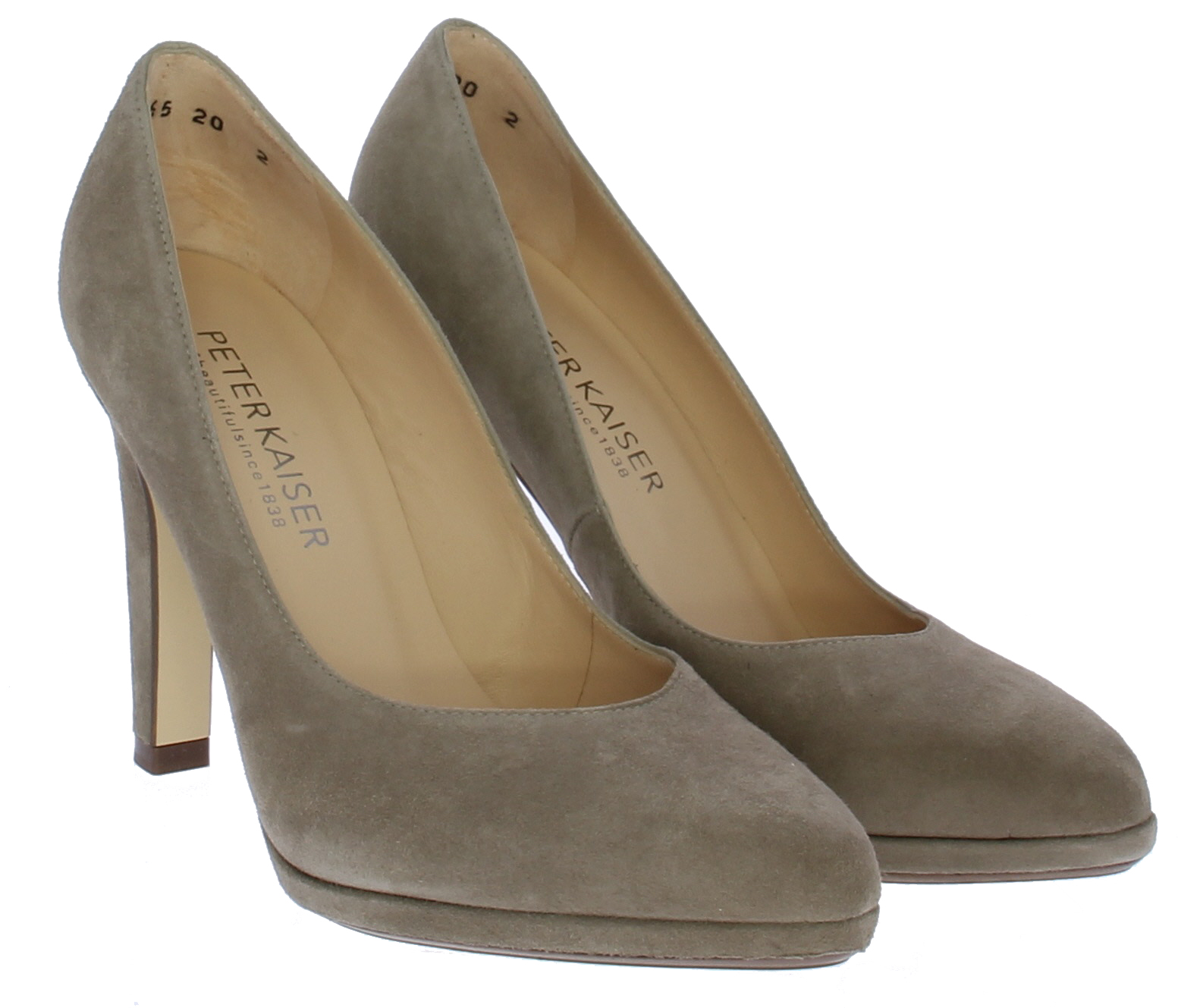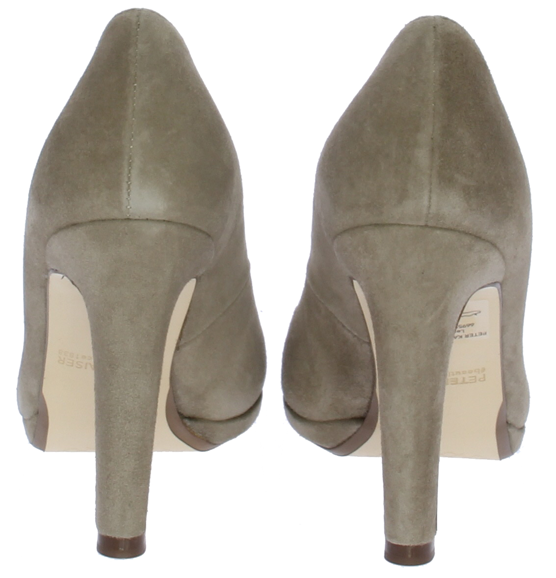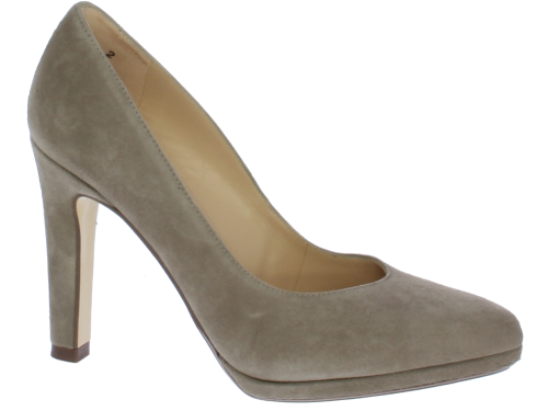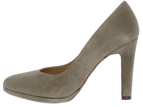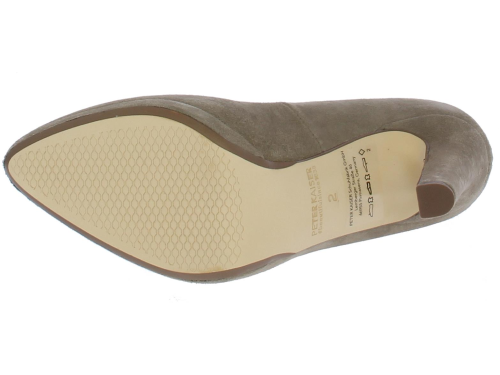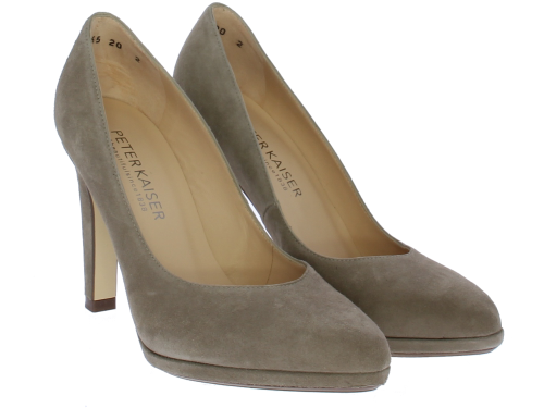 Taupe-kleurige dames pump van Peter Kaiser. De pump heeft een 9 centimeter hoge hak maar door het plateau loopt deze zeer comfortabel. De pump heeft een mooie vrouwelijke V-uitsnijding op de voorvoet. De zool is leer.