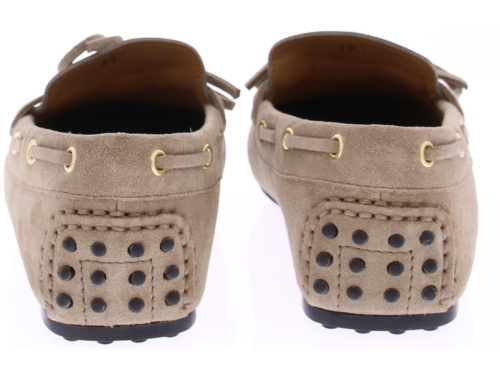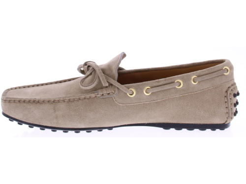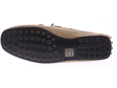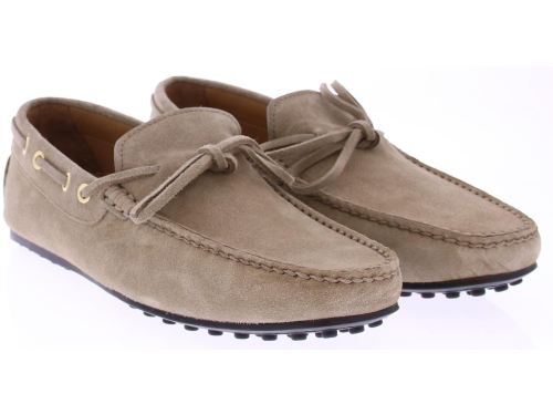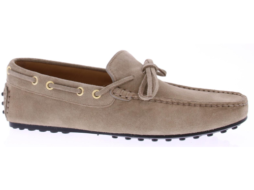 Taupe-kleurige suede heren instapper van Valdorini. Deze schoen komt op een rubberen zool met nopjes en heeft een touwtje rondom lopen, zoals bij een bootschoen.
