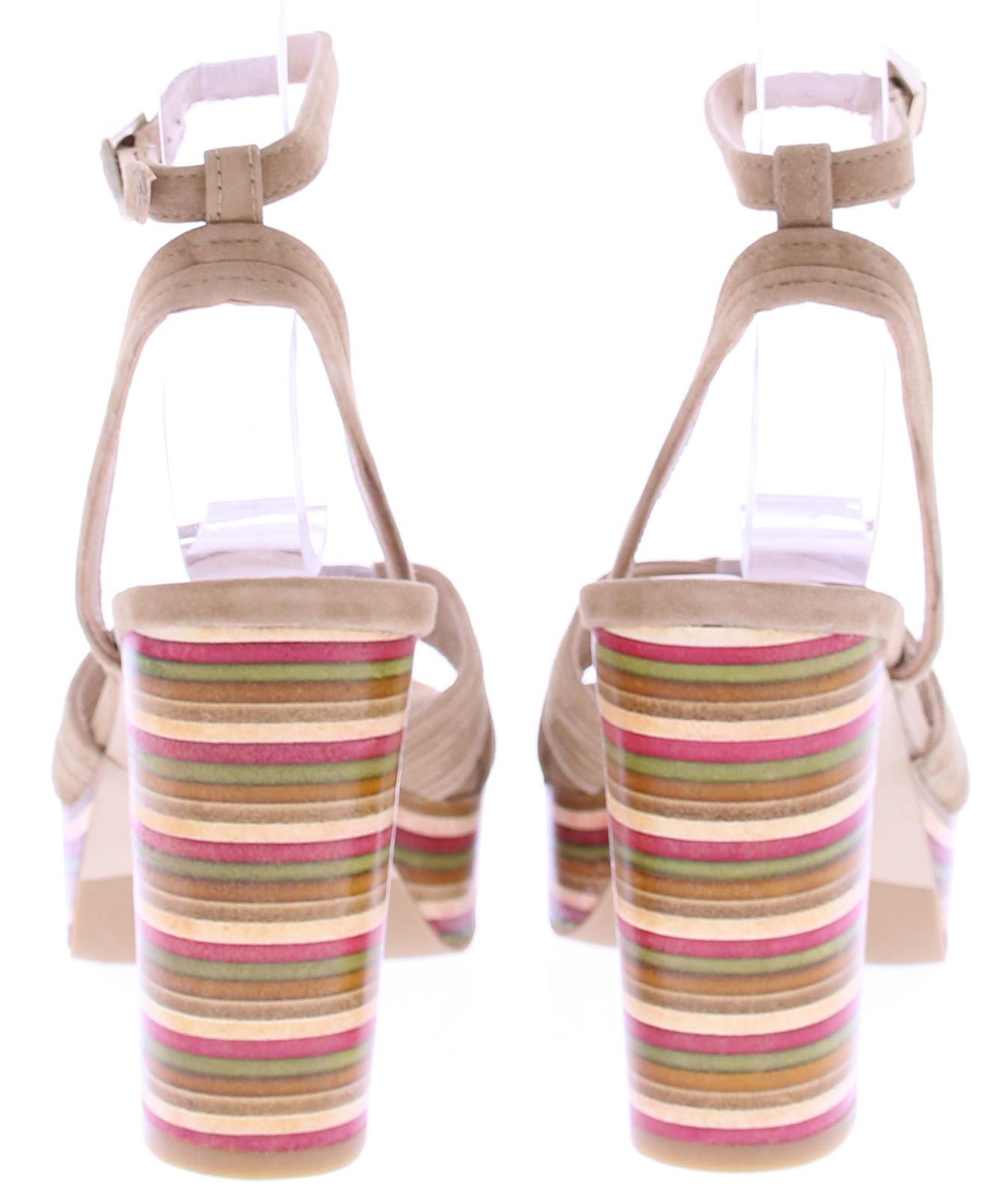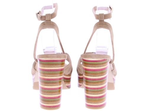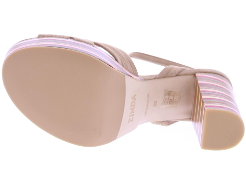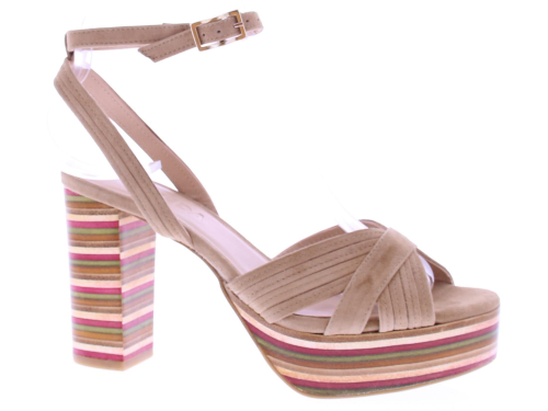 Taupe suede plateau sandaal van Zinda. Met mooie rechte hak van 9 cm leuk uitgevoerd met een streepjes patroon en plateau zool van 1,5 cm. De sierlijke belijning over de wreef en het enkelbandje maakt hem extra vrouwelijk.