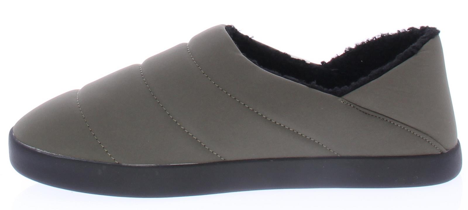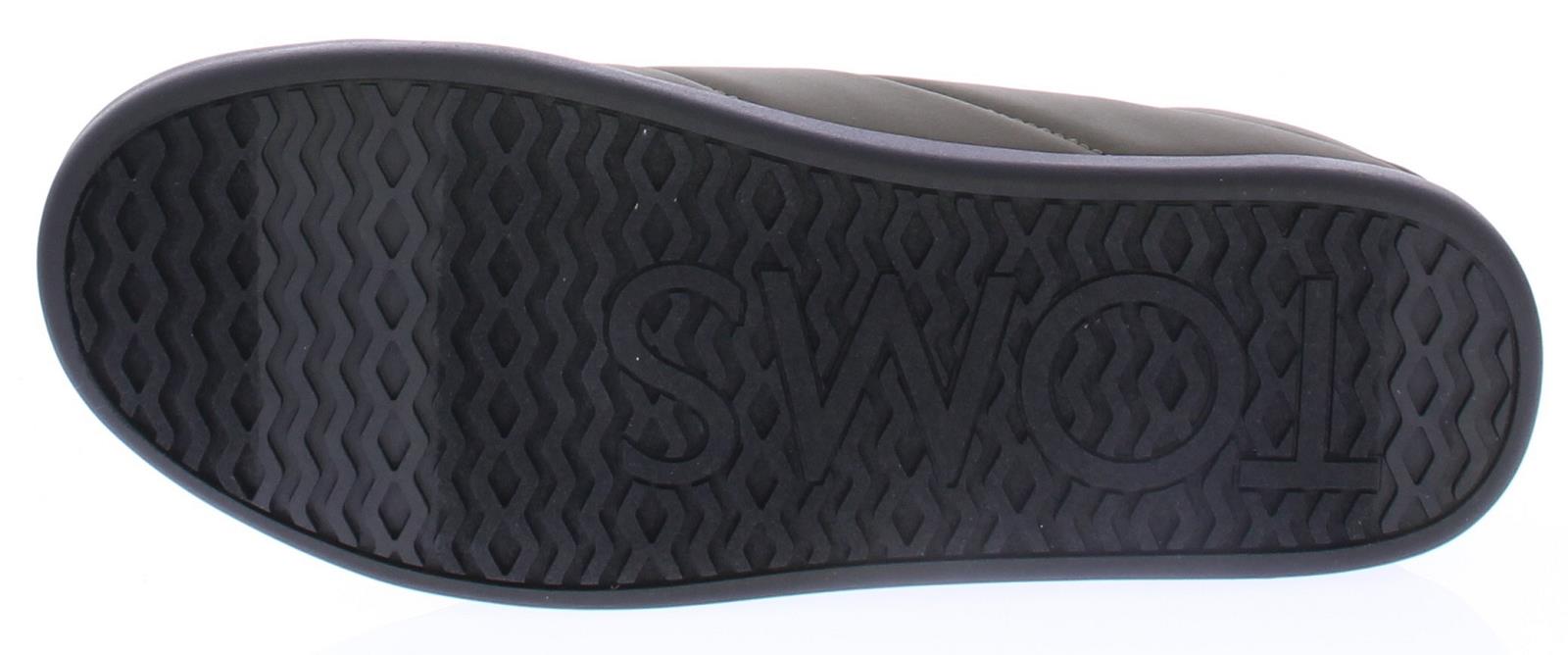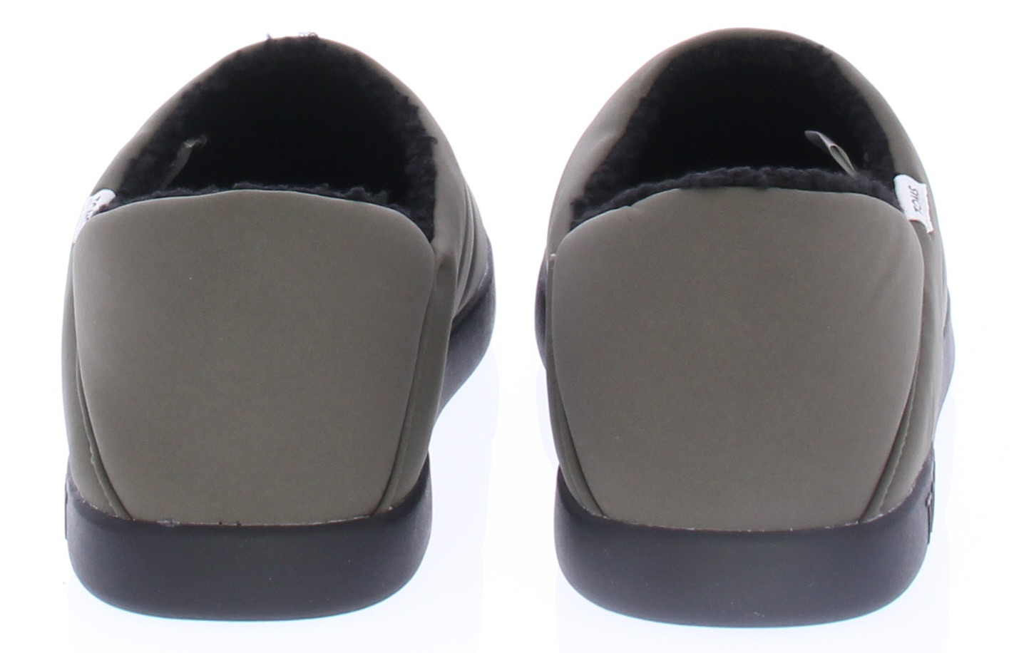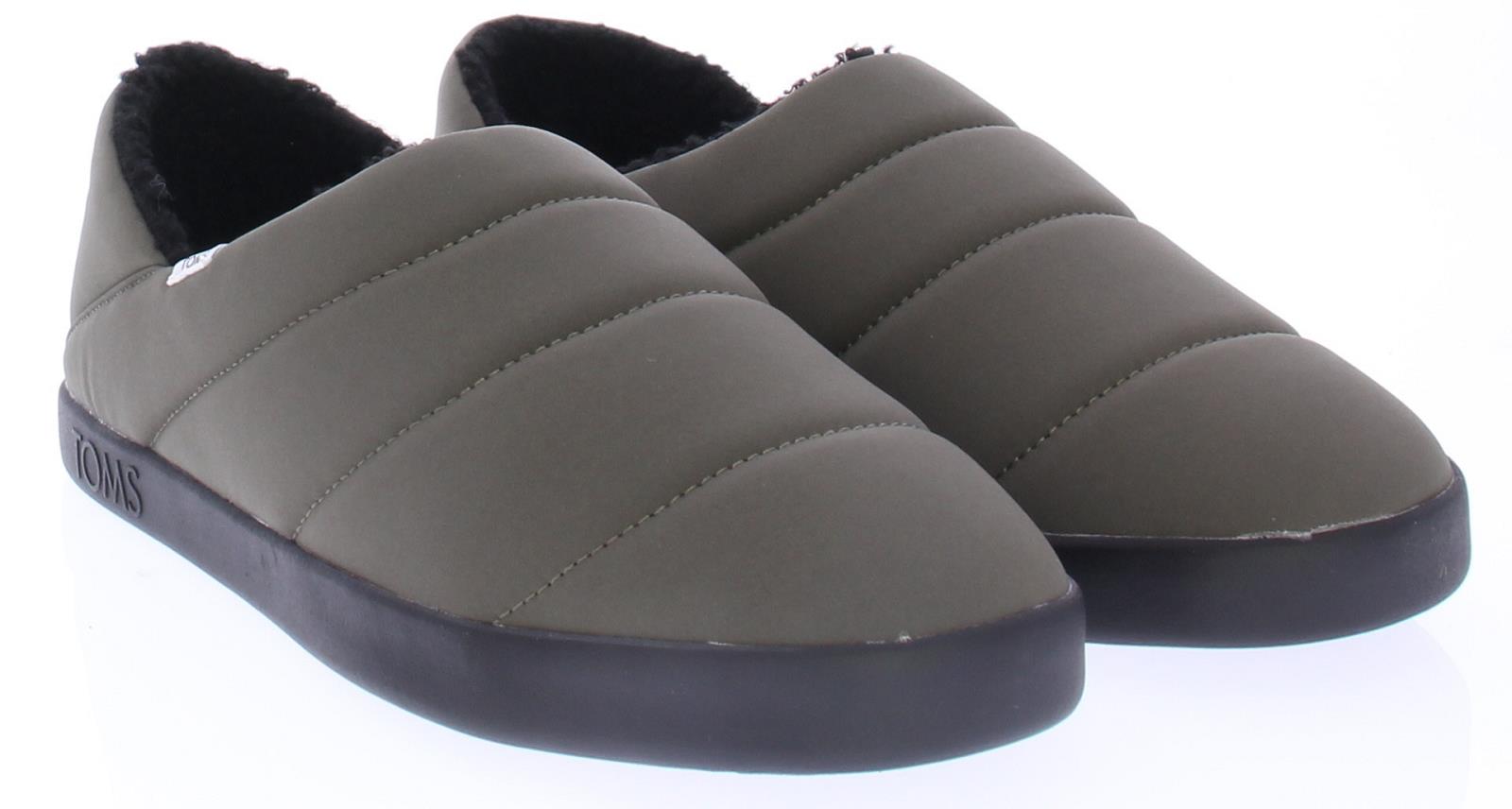 Groene suede heren pantoffel van Toms. Deze pantoffel heeft een zachte binnenvoering van stof en komt op een rubberen zool.