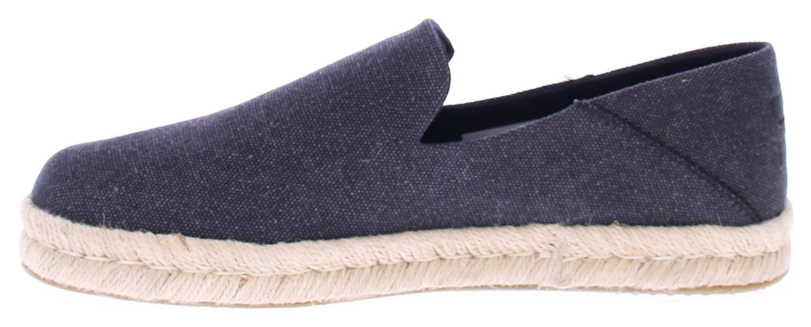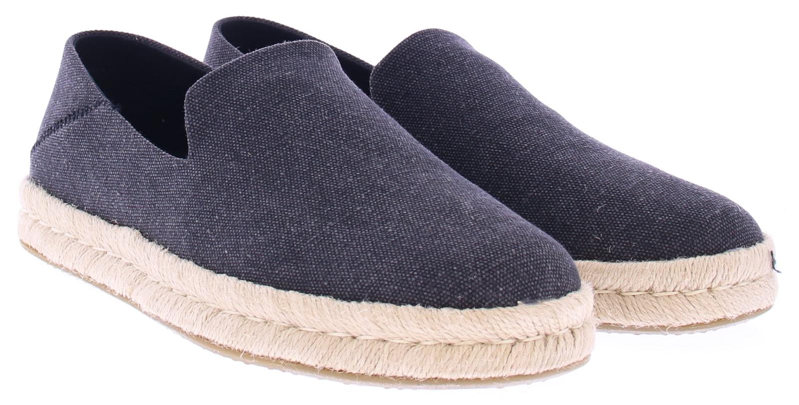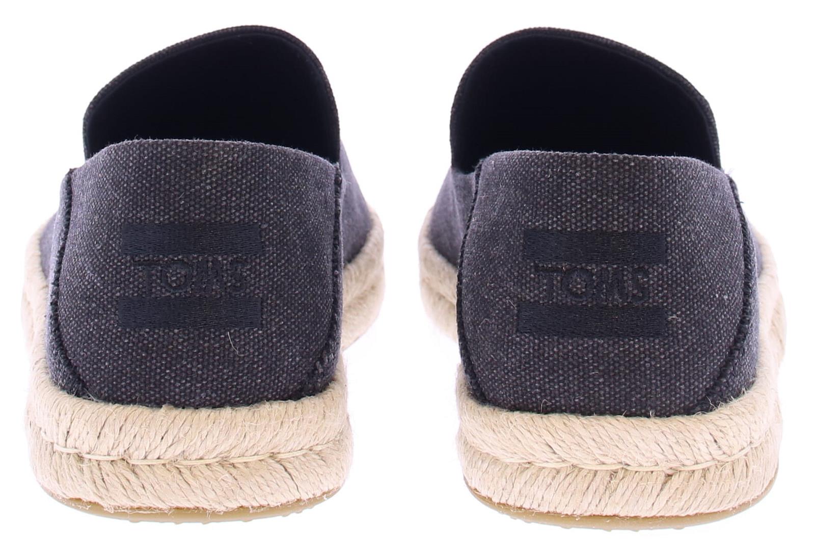 Toms heren instapper in zwart canvas met grove touwrand rond de zool. De schoen heeft een voering van stof en uitneembaar voetbed.