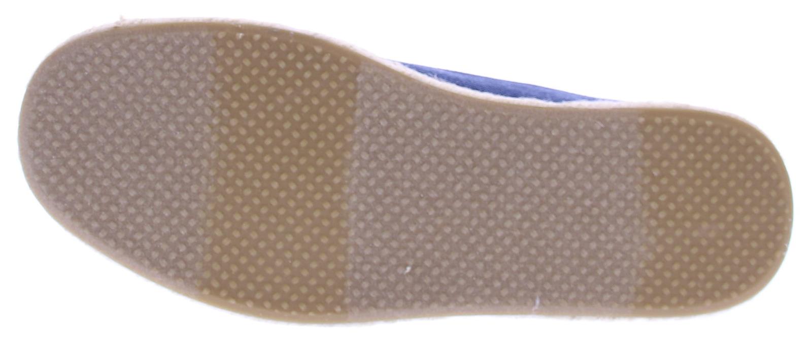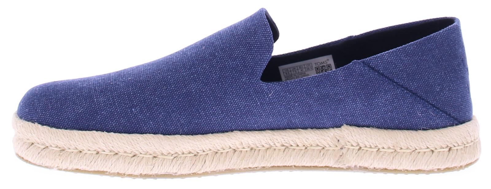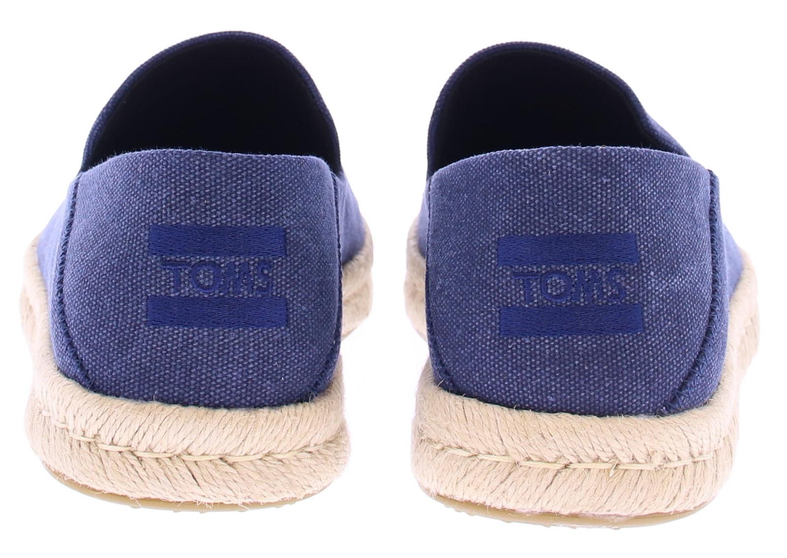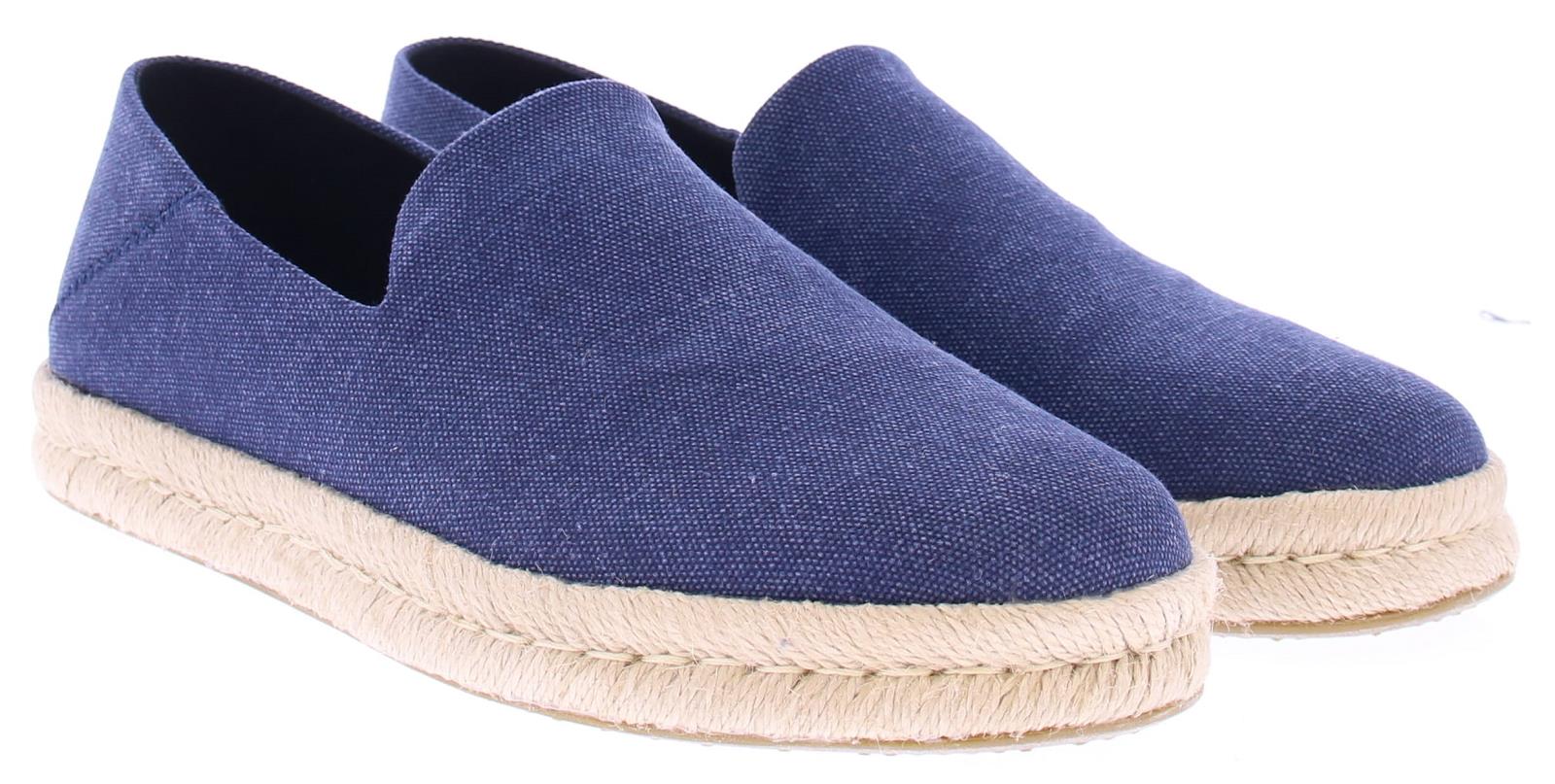 Toms heren instapper in donker blauw canvas met grove touwrand rond de zool. De schoen heeft een voering van stof en uitneembaar voetbed.