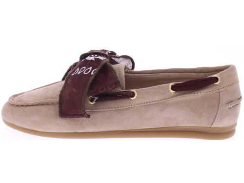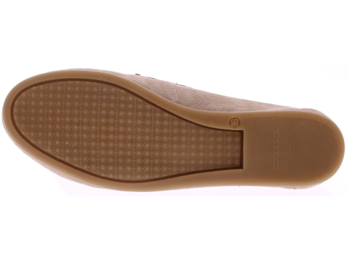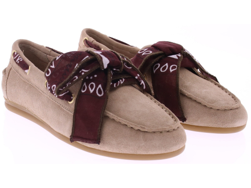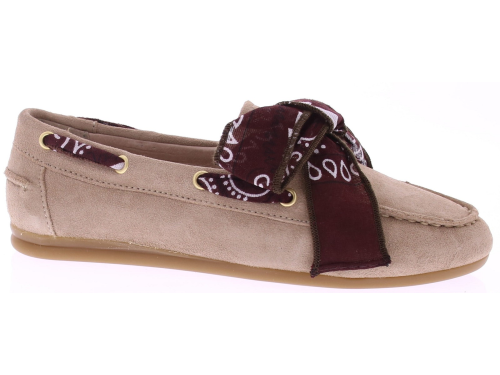 Beige suède dames schoenen van Toral, model Nahua Bandana. Deze speelse veterschoen krijgt een unieke twist door de donkerbruine bandana-details die door de goudkleurige oogjes zijn geregen. Het zachte suède geeft een comfortabele pasvorm, terwijl de mocassin-stijl zorgt voor een nonchalante, eigentijdse look. Een perfecte keuze voor wie houdt van casual schoenen met een opvallend mode-accent. Ontdek ook de andere dames schoenen van Toral bij Klijsen.