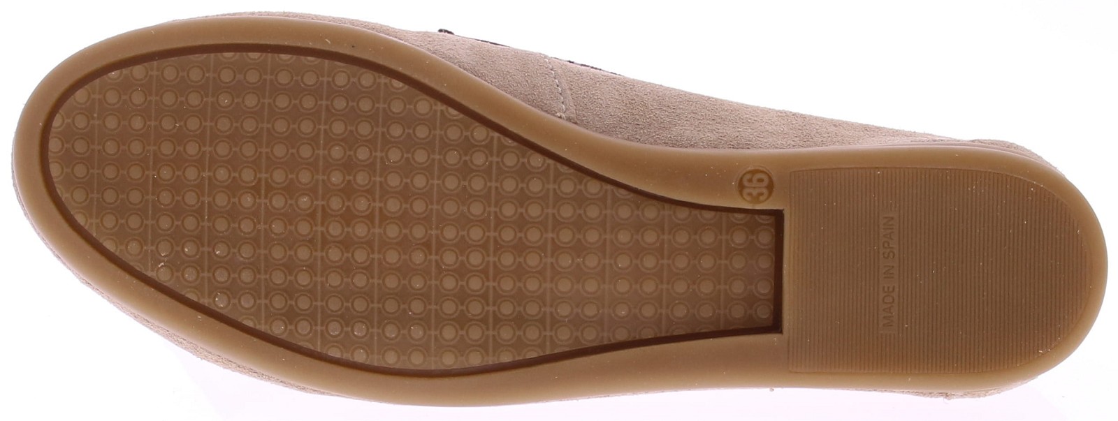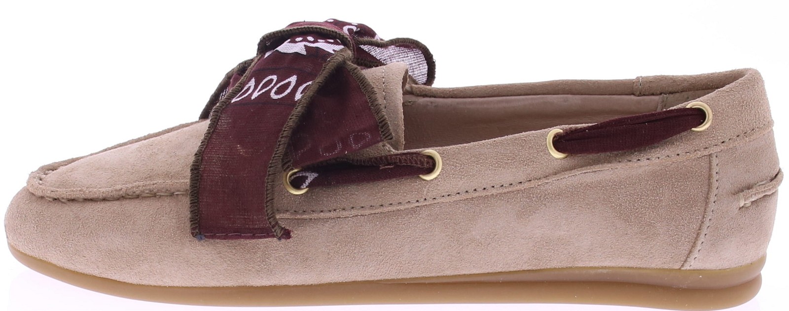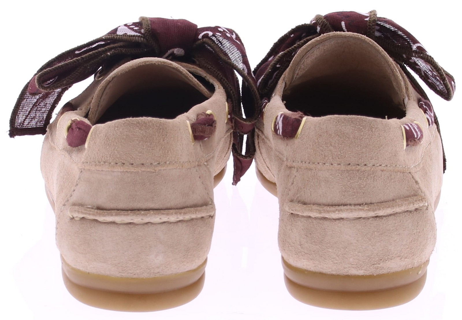 Beige suède dames schoenen van Toral, model Nahua Bandana. Deze speelse veterschoen krijgt een unieke twist door de donkerbruine bandana-details die door de goudkleurige oogjes zijn geregen. Het zachte suède geeft een comfortabele pasvorm, terwijl de mocassin-stijl zorgt voor een nonchalante, eigentijdse look. Een perfecte keuze voor wie houdt van casual schoenen met een opvallend mode-accent. Ontdek ook de andere dames schoenen van Toral bij Klijsen.