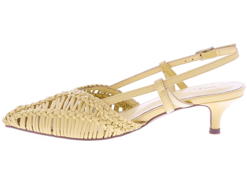 Gele dames slingback pumps van Toral, model Kytrin. Dit verfijnde model heeft een fraai gevlochten ontwerp dat luchtig en elegant om de voet valt. De spitse neus en de slanke hak van 4 cm geven de pump een vrouwelijke uitstraling, terwijl het verstelbare bandje rond de enkel zorgt voor een stabiele pasvorm. Een stijlvolle keuze die moeiteloos combineert met zowel een jurk als een mooie pantalon. Ontdek ook de andere dames pumps van Toral bij Klijsen.