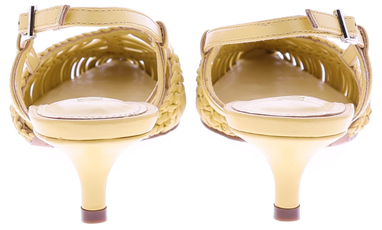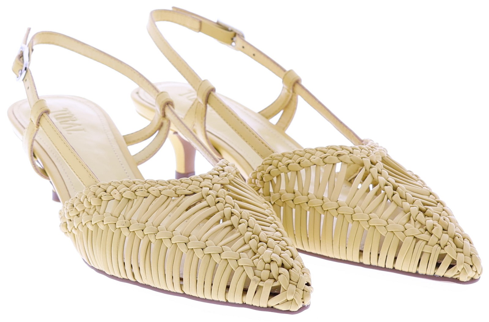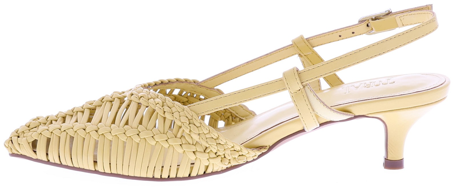 Gele dames slingback pumps van Toral, model Kytrin. Dit verfijnde model heeft een fraai gevlochten ontwerp dat luchtig en elegant om de voet valt. De spitse neus en de slanke hak van 4 cm geven de pump een vrouwelijke uitstraling, terwijl het verstelbare bandje rond de enkel zorgt voor een stabiele pasvorm. Een stijlvolle keuze die moeiteloos combineert met zowel een jurk als een mooie pantalon. Ontdek ook de andere dames pumps van Toral bij Klijsen.
