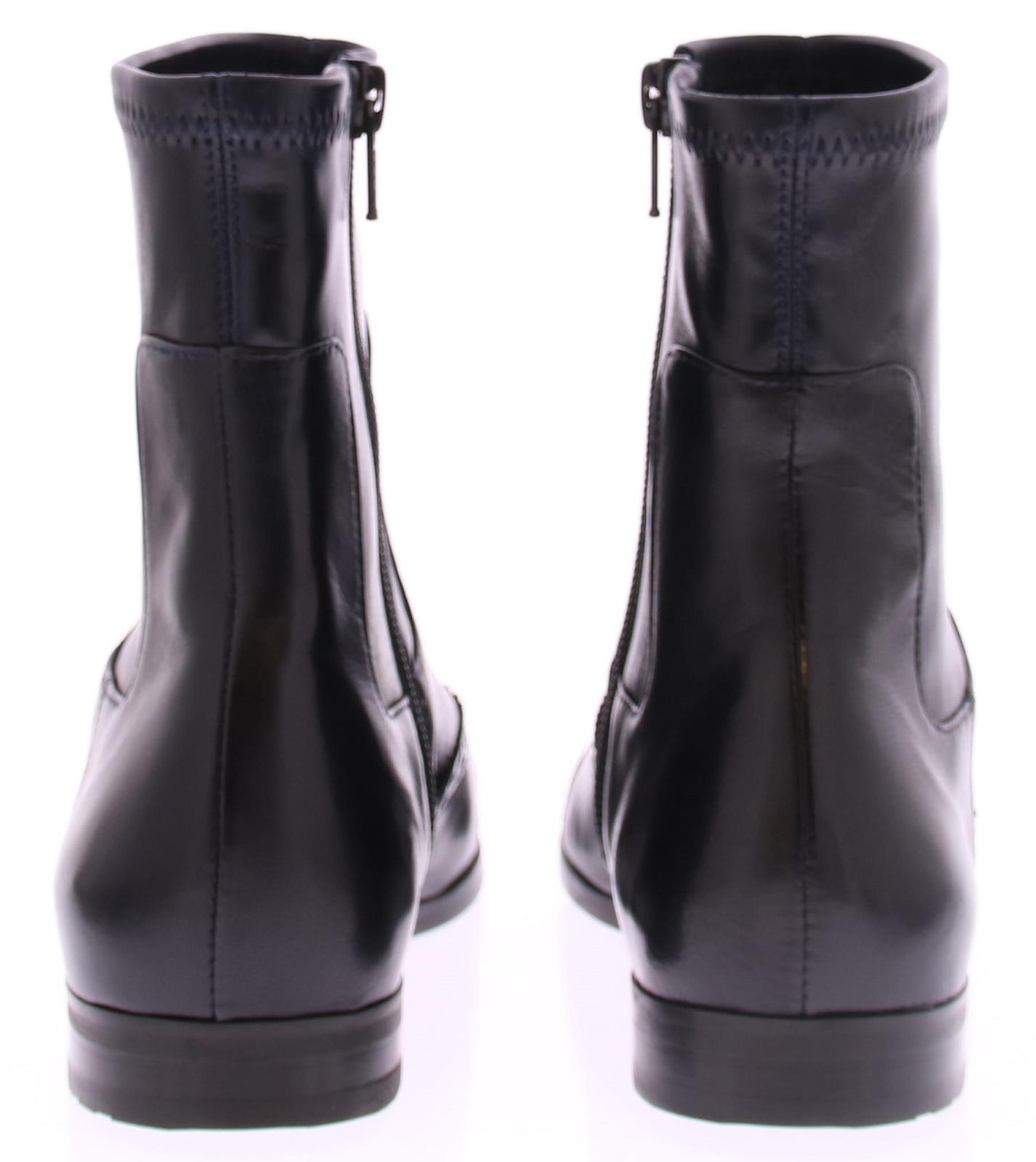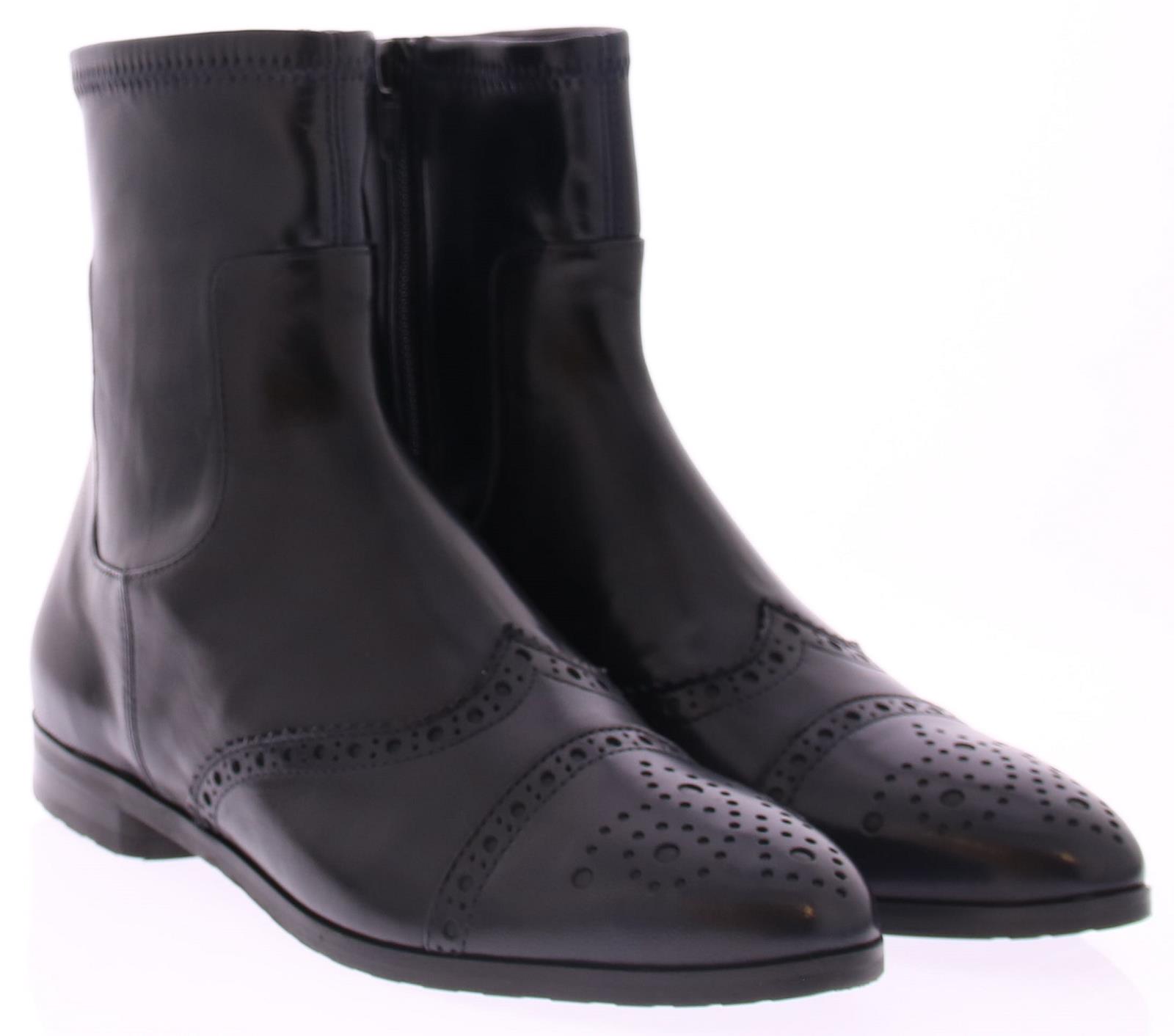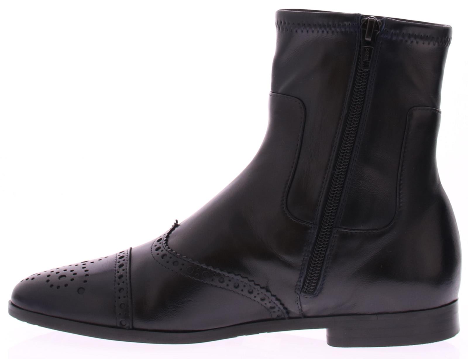 Donkerblauwe leren enkellaars voor dames van Truman's . Deze laarzen zijn afgewerkt met een geperforeerde belijningen over de voet en heeft een hak van 2 cm hoog. Rondom de enkel strecht leer waardoor de laars goed aansluit. De voering is van leer en de zool van rubber.