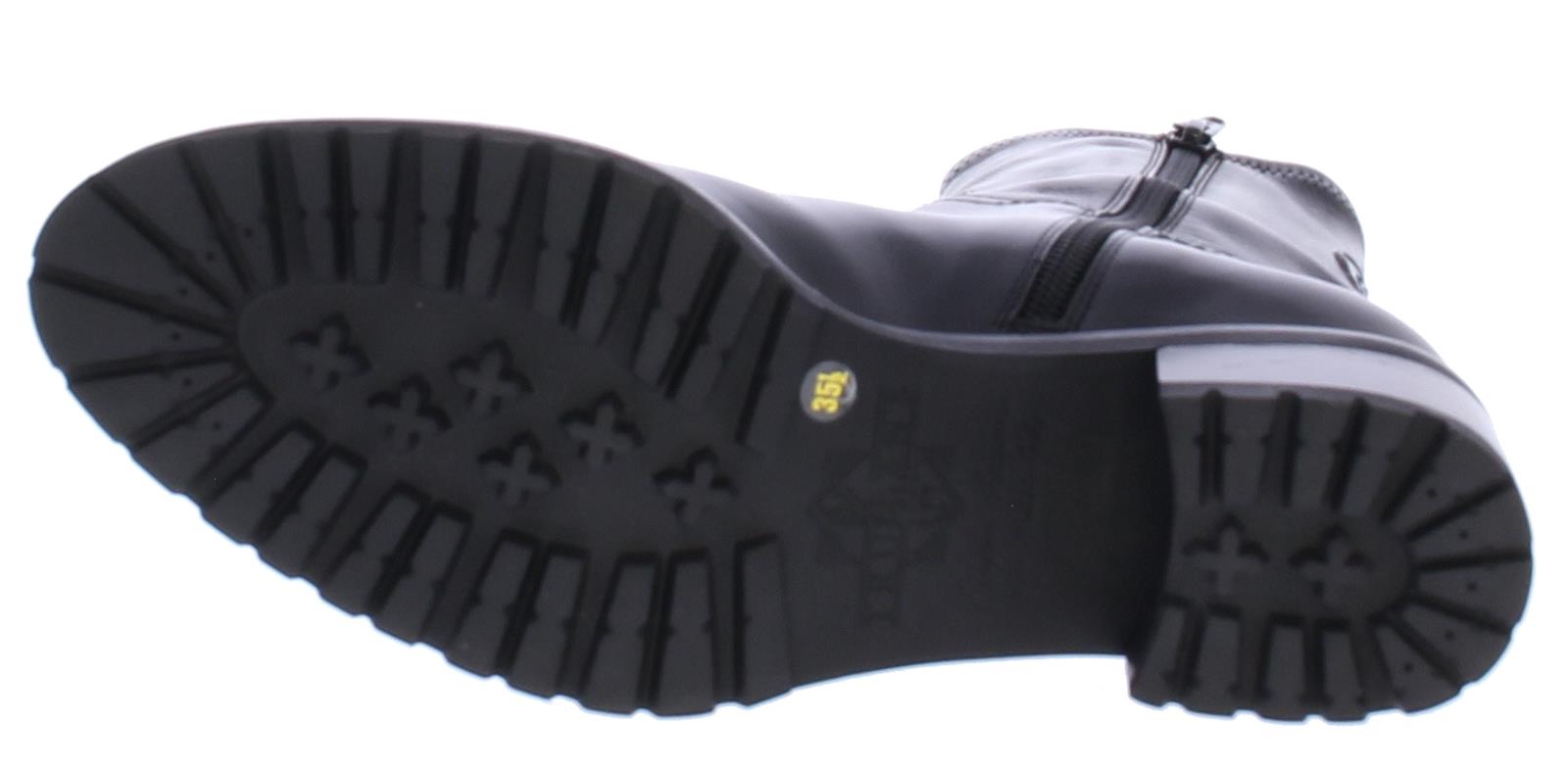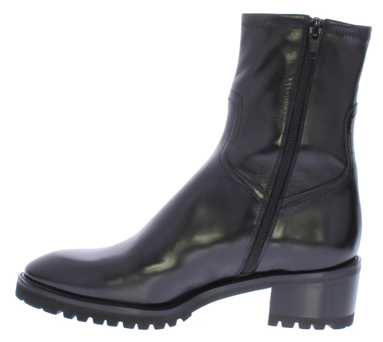 Zwart leren dames laars van Trumans. De schacht is van soepel strech leer, wat mooi aanluit om de enkel. Heeft ook een ritsluiting aan de binnenkant van de laars. De hak hoogte is ongeveer 4 cm. De zool is van rubber en heeft een iets grof profile.