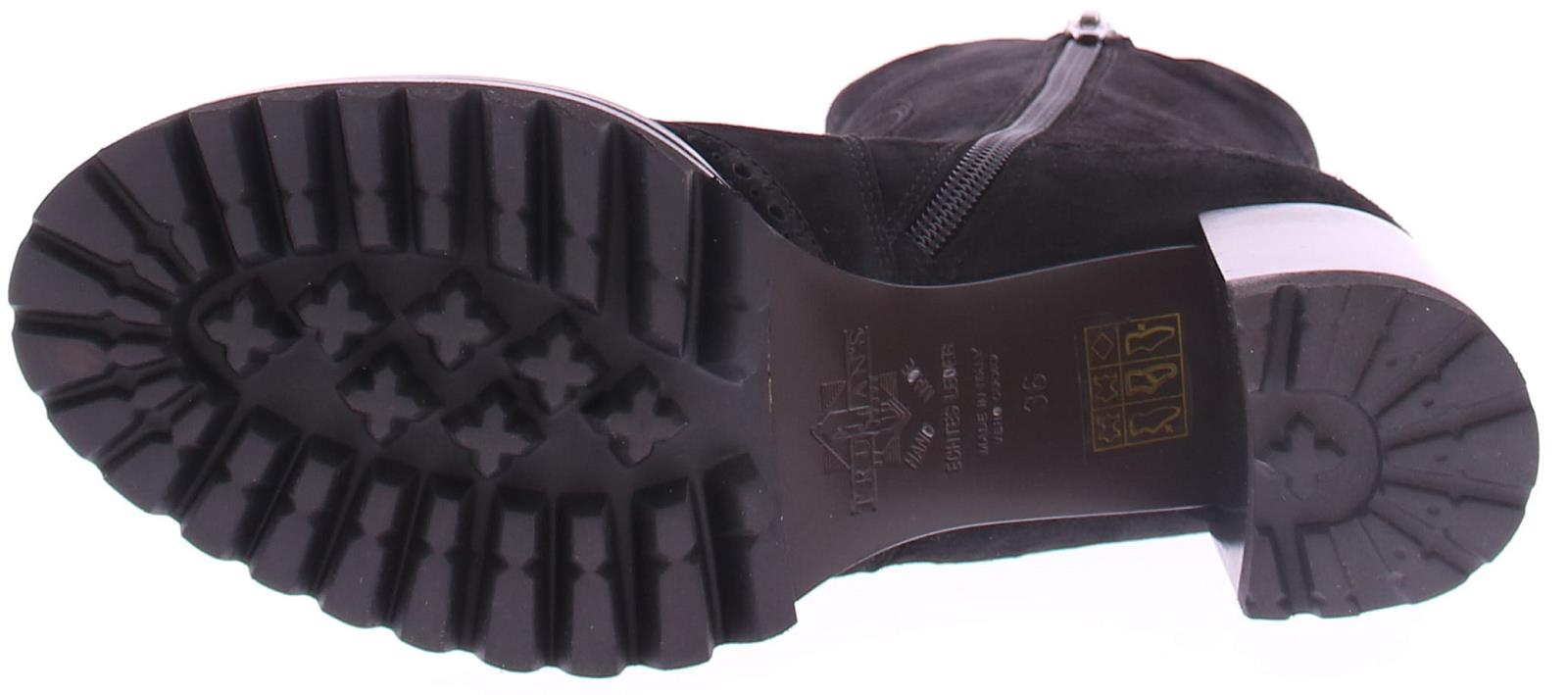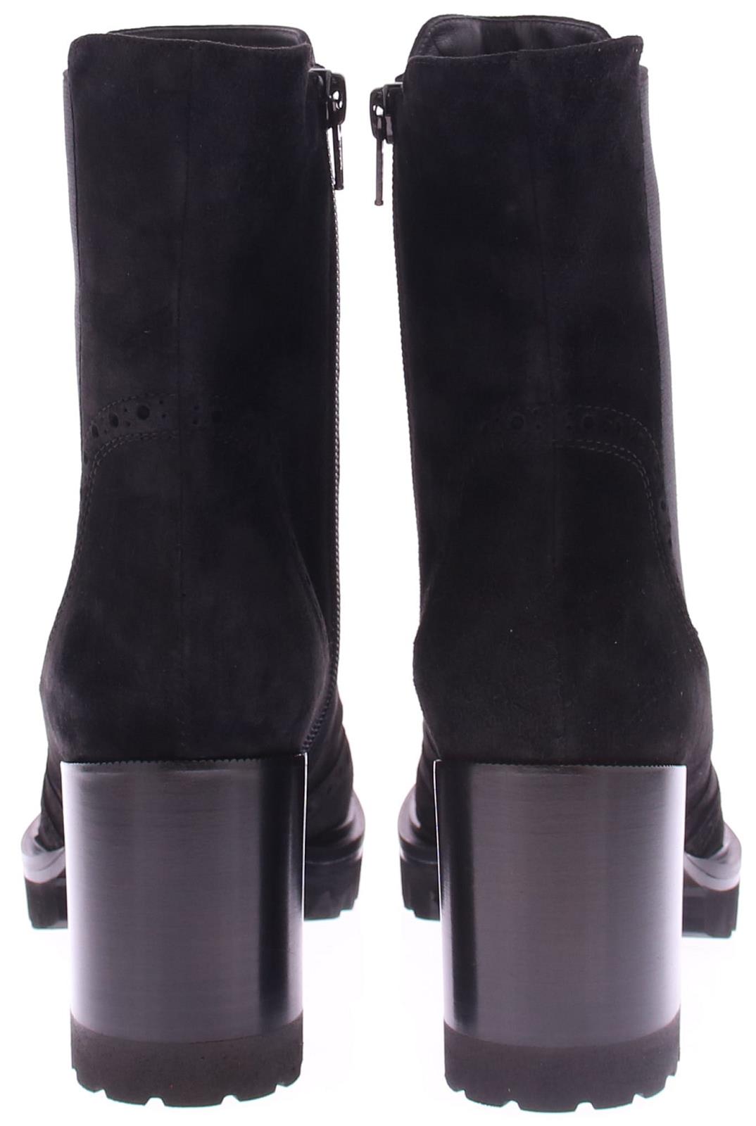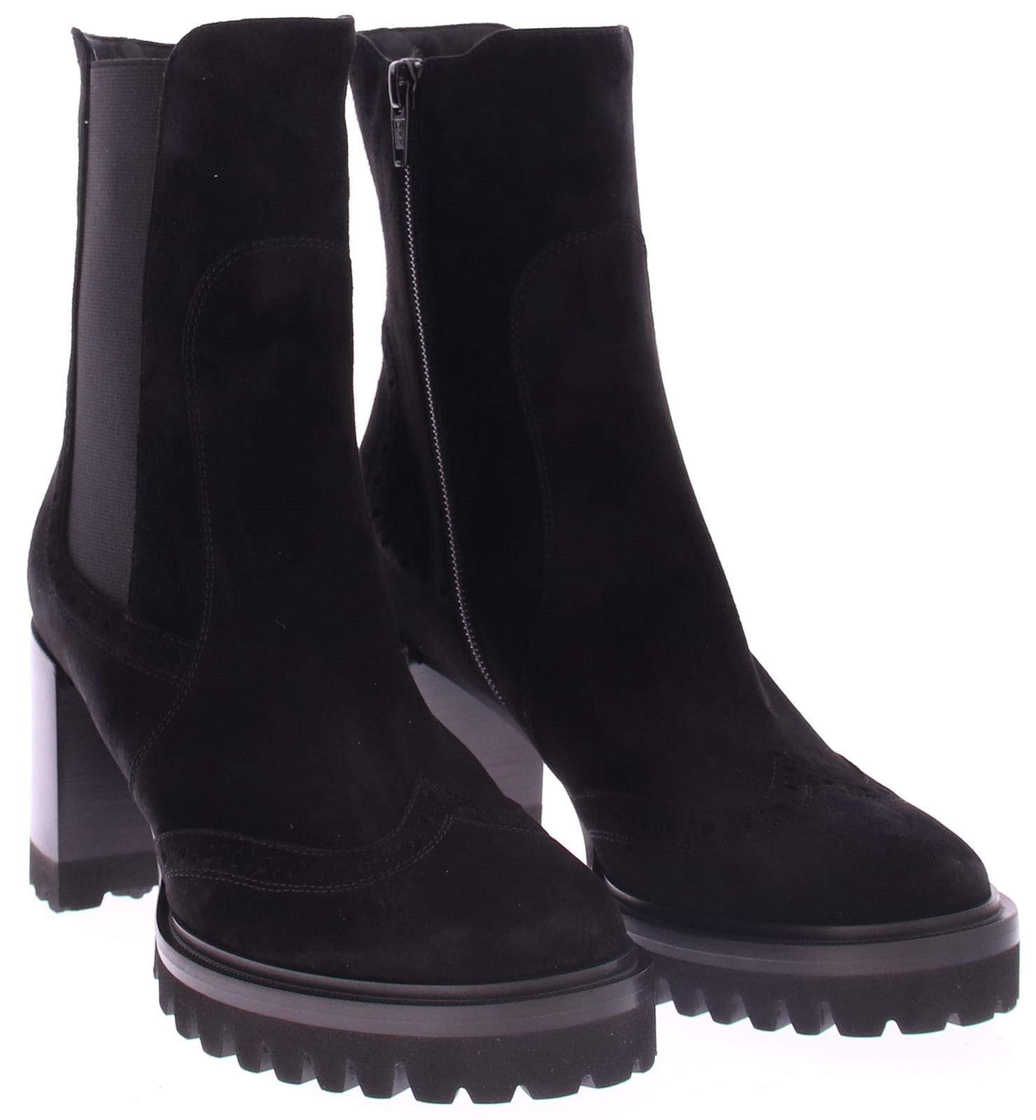 Zwart suede dames korte laars van Truman's. Deze laars heeft een doorgestikte belijning. Het elastiek aan de zijkant zorgt dat u de laars makkelijk kan aan en uit kan trekken. De blokhak heeft een hoogte van 6 cm. De plateauzool is van rubber en heeft een grof profiel.