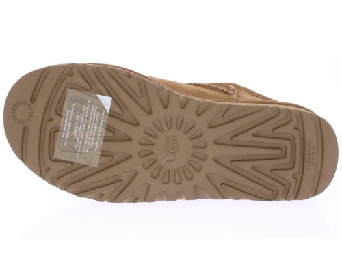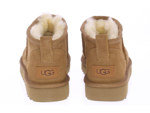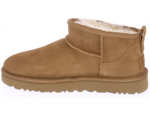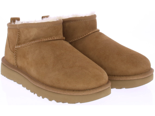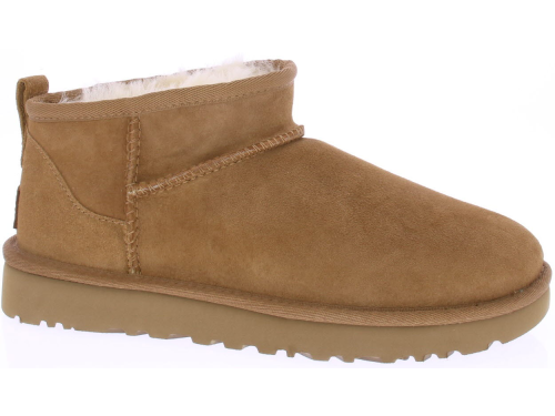 Middenbruin suede dames enkellaars van Ugg. De Classic Ultra Mini in chestnut. Heerlijk warm en comfortabel met schapenvacht gevoerd.