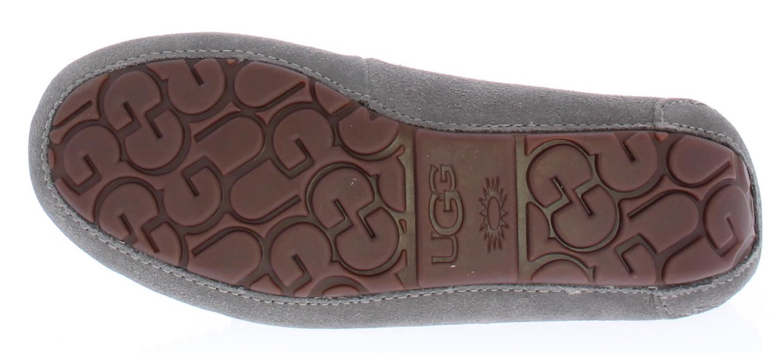 Middengrijs suede dames pantoffel van Ugg. Deze moccassin pantoffel is gemaakt van suede met de bekende heerlijk zachte schapenvacht voering, die de eigen lichaamstemperatuur aan neemt. Als leuk detail loopt er een lichtbruine veter rondom de schoen. De rubberen zool zorgt voor antislip en is geschikt om even de tuin mee in te lopen. Dit model valt wat kleiner.