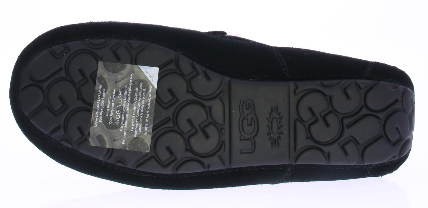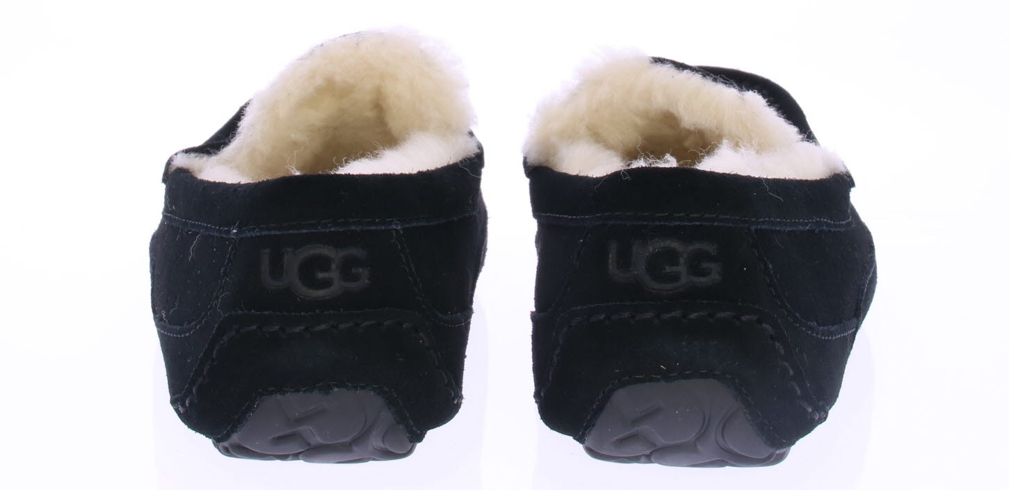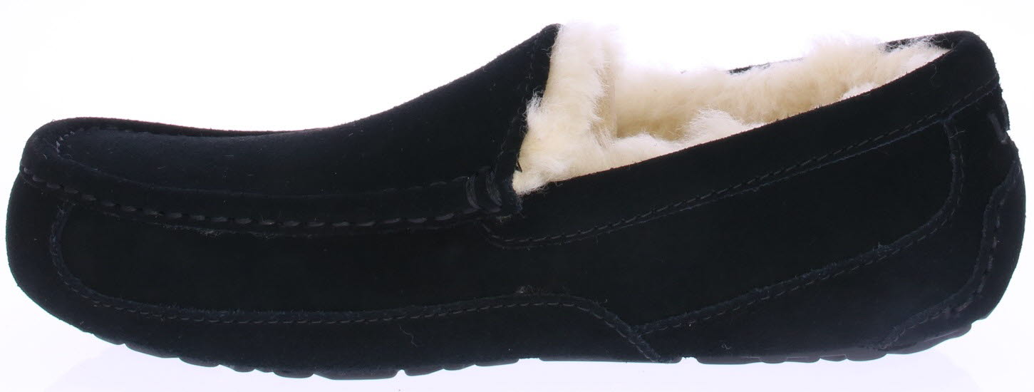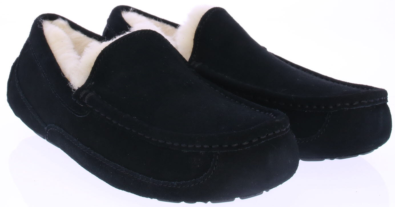 Zwart suede heren pantoffel van Ugg. De artikel naam van deze pantoffel is 'Ascot Black'. De pantoffel is gevoerd met schapenvacht wat de eigen lichaamstemperatuur behoud. De zool is van rubber.