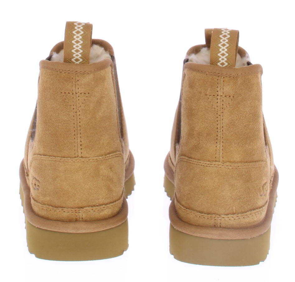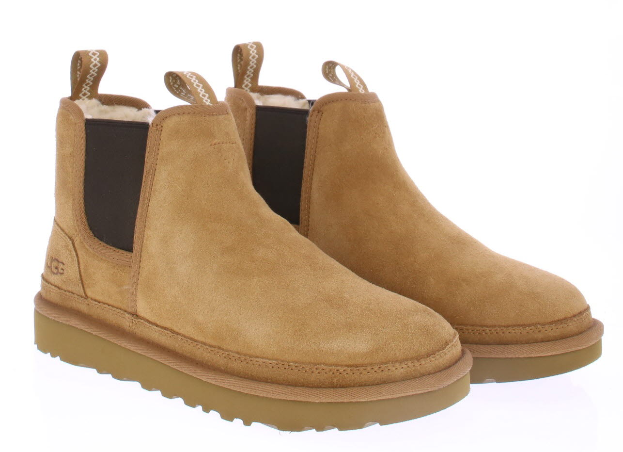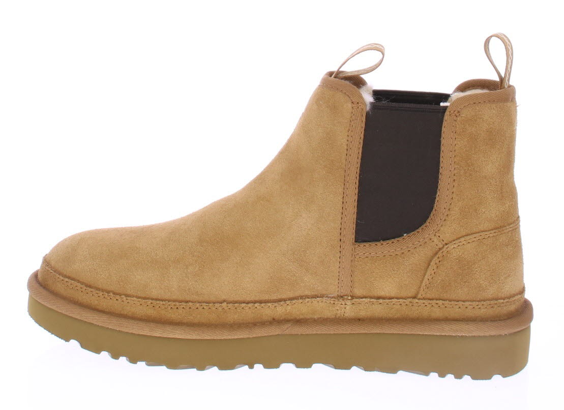 Middenbruin suede heren Chelseaboot van UGG. De artikel naam van deze schoen is 'Neumel Chelsea Chestnut.' Deze schoen heeft een voering van schapenvacht en is daarmee perfect voor winters weer. De schoen heeft twee treklussen aan de schacht voor een gemakkelijke instap.