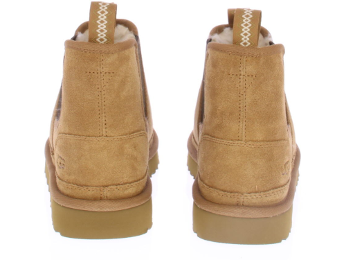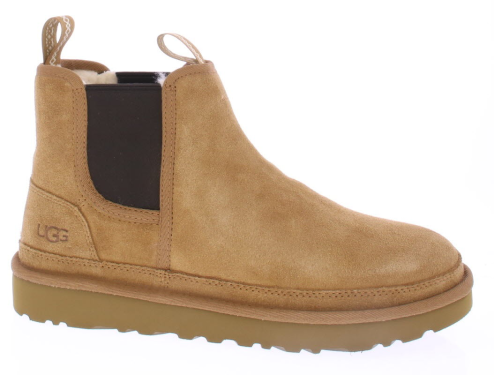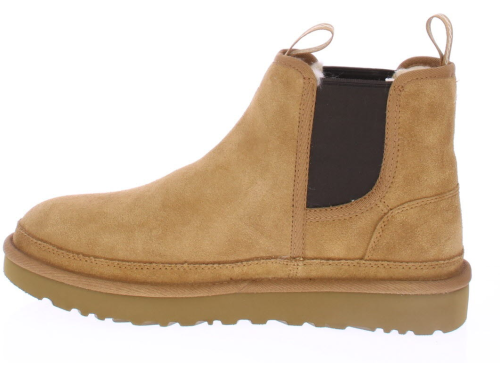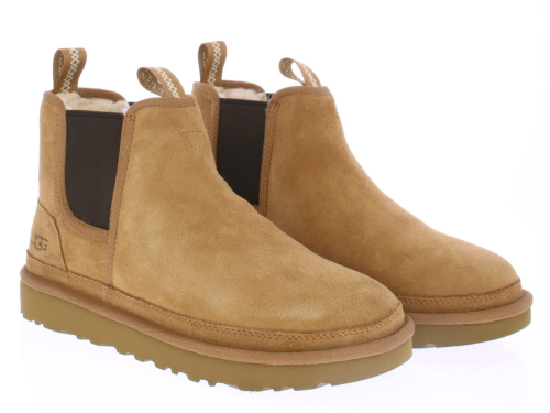 Middenbruin suede heren Chelseaboot van UGG. De artikel naam van deze schoen is 'Neumel Chelsea Chestnut.' Deze schoen heeft een voering van schapenvacht en is daarmee perfect voor winters weer. De schoen heeft twee treklussen aan de schacht voor een gemakkelijke instap.