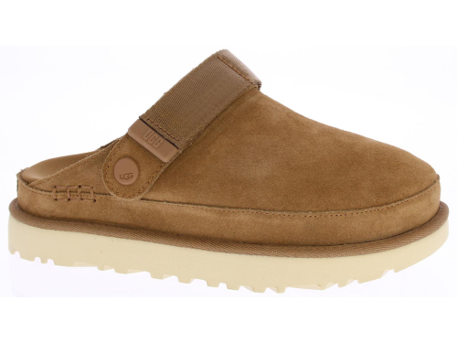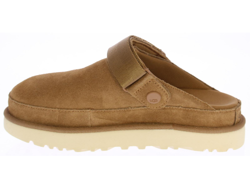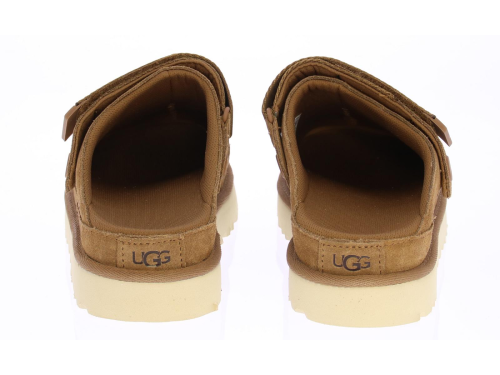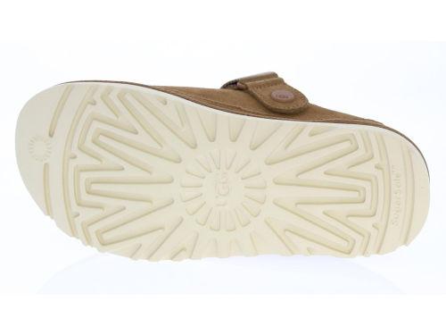 Middenbruin suede dames muil van Ugg. Deze muil is uitgevoerd in bruin suede aan de buitenkant, de voering is van zachte stof, en heeft een superzacht voetbed. De band om de hiel met stoffen logo kan ook naar voren gedragen worden. De zool is van rubber.