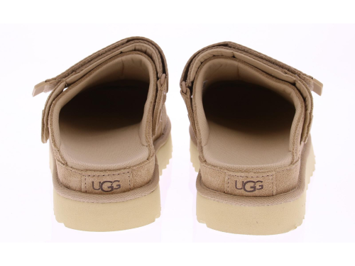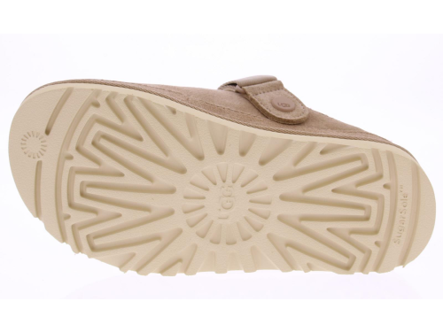 Zandkleurige suede dames muil van Ugg. Deze muil is uitgevoerd in bruin suede aan de buitenkant de voering is van zachte stof, en heeft een superzacht voetbed. De band om de hiel met stoffen logo kan ook naar voren gedragen worden. De zool is van rubber.