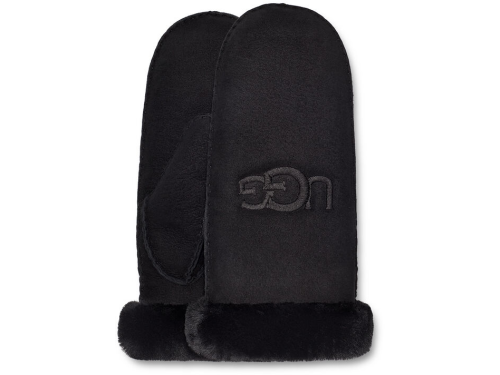 Zwarte suede dames wanten van UGG. Deze ultrazachte wanten van luxueuze sheepskin met een waterafstotende laag houden je stijlvol warm. Dit paar is uitgevoerd met pluizige omslagboorden die de kou buiten houden en een geborduurd UGG-logo. Ze passen perfect bij oorwarmers en sjaals van UGG.