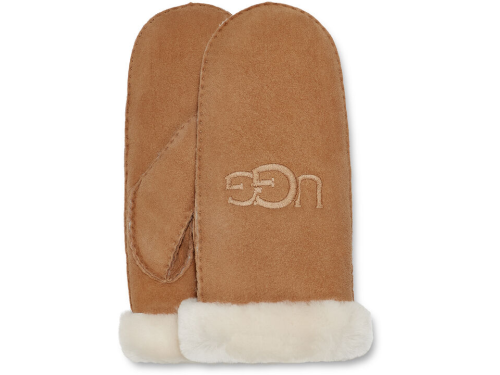 Middenbruin suede dames wanten van UGG. Deze ultrazachte wanten van luxueuze sheepskin met een waterafstotende laag houden je stijlvol warm. Dit paar is uitgevoerd met pluizige omslagboorden die de kou buiten houden en een geborduurd UGG-logo. Ze passen perfect bij oorwarmers en sjaals van UGG.