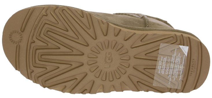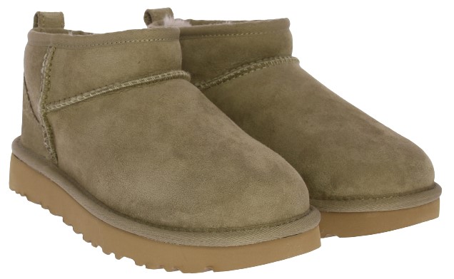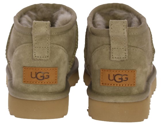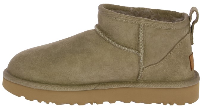 Khaki-kleurige suede dames ultra mini van Ugg. Dit model is aan de buitenkant vervaardigd uit suede en voorbehandeld met vlek- en waterafstotende middelen. De binnenvoering is gemaakt van het welbekende schaapswol waardoor de voeten altijd verwarmd zijn. De treklus op de achterbies helpt het aan- en uittrekken te versoepelen.