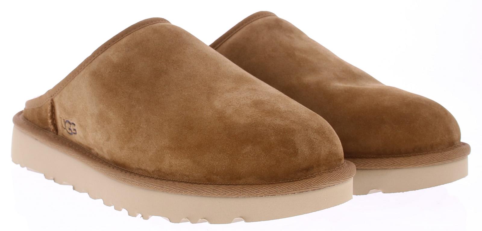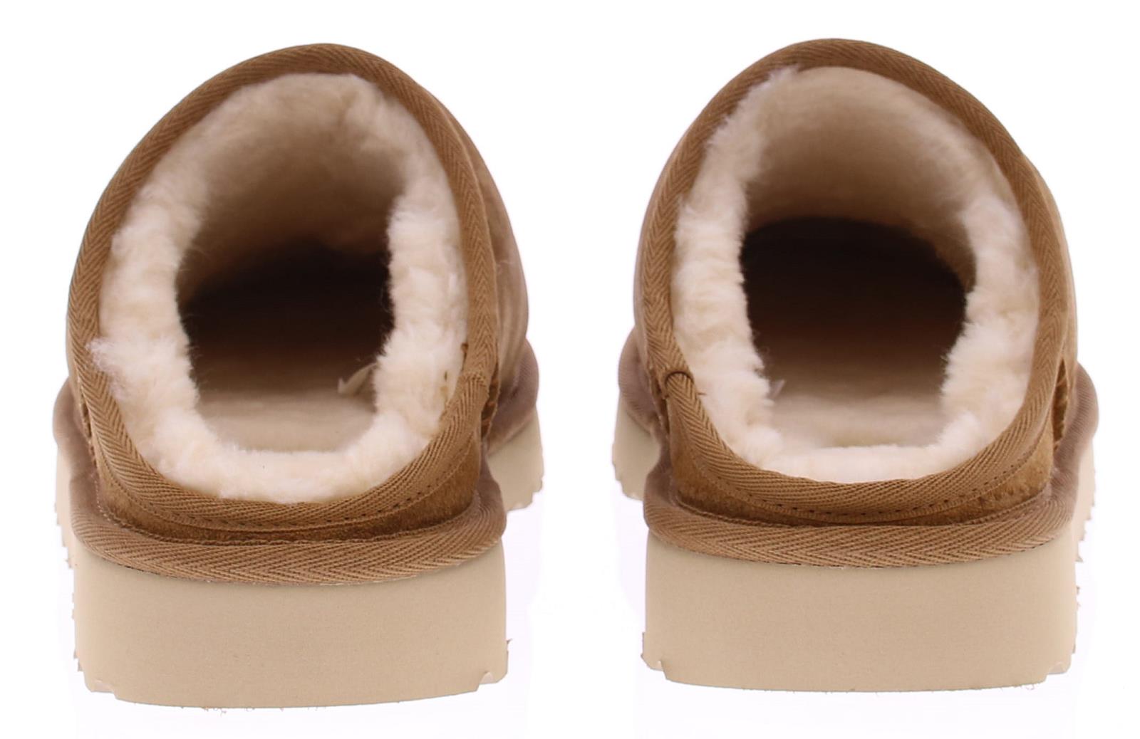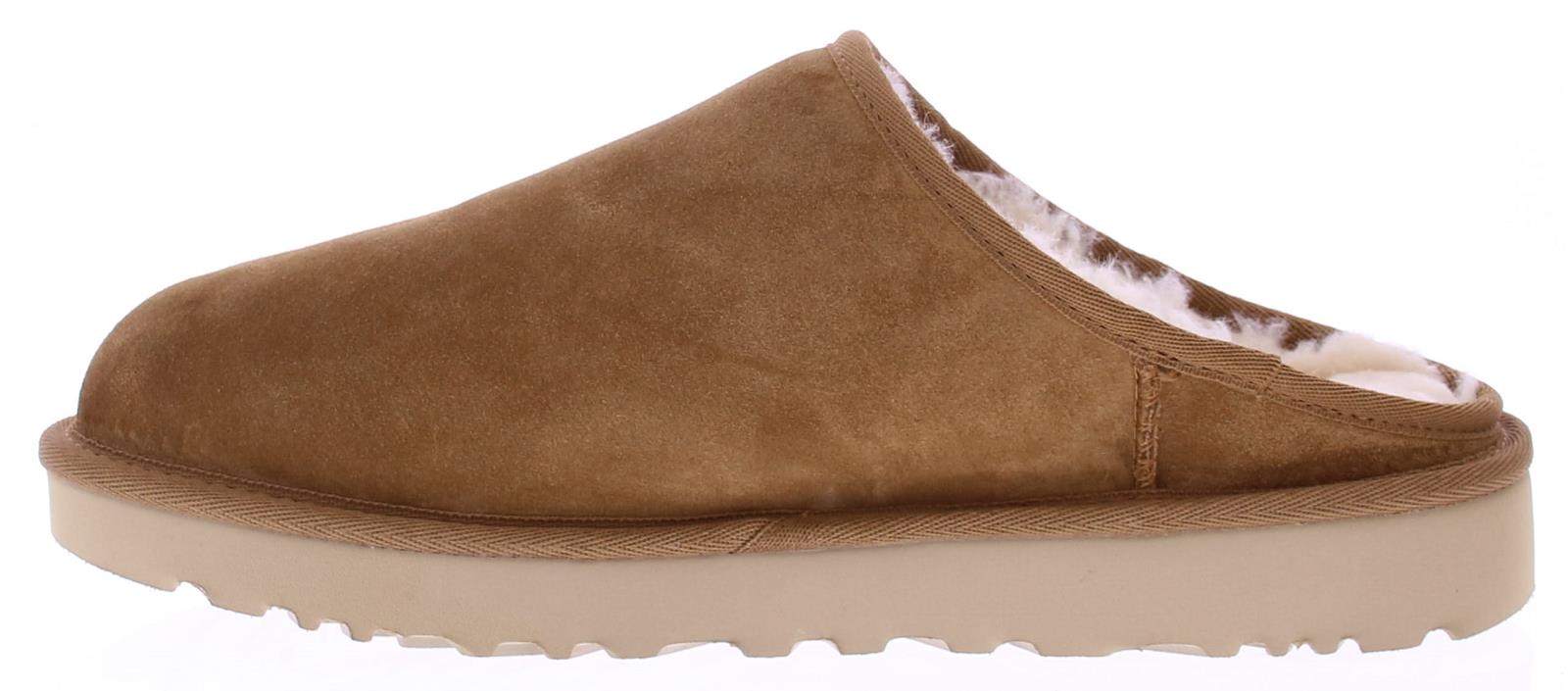 Middenbruin suède heren pantoffel van Ugg, de Classic slip-on in de kleur chestnut. Heerlijke zachte pantoffel van suede met de bekende warme en comfortabele schapenvacht voering. Aan de zijkant zit een Ugg logo gedrukt. De zool is van rubber.