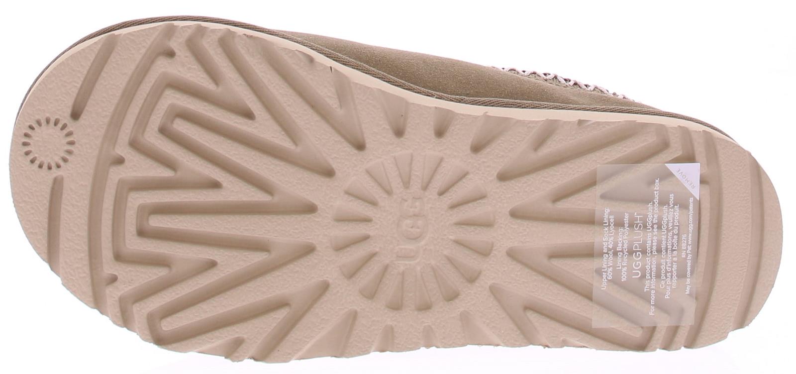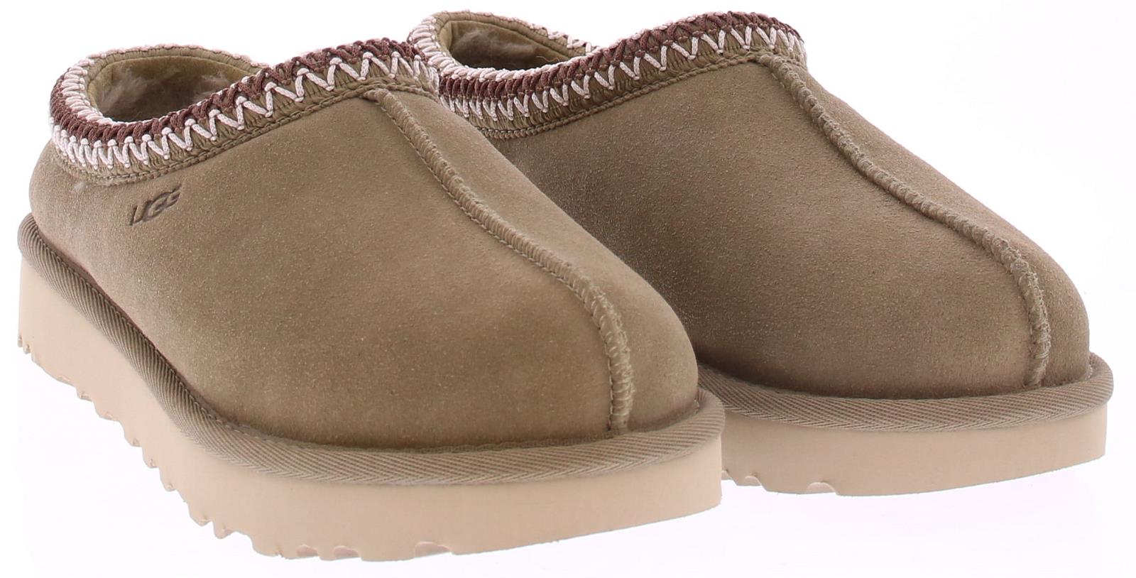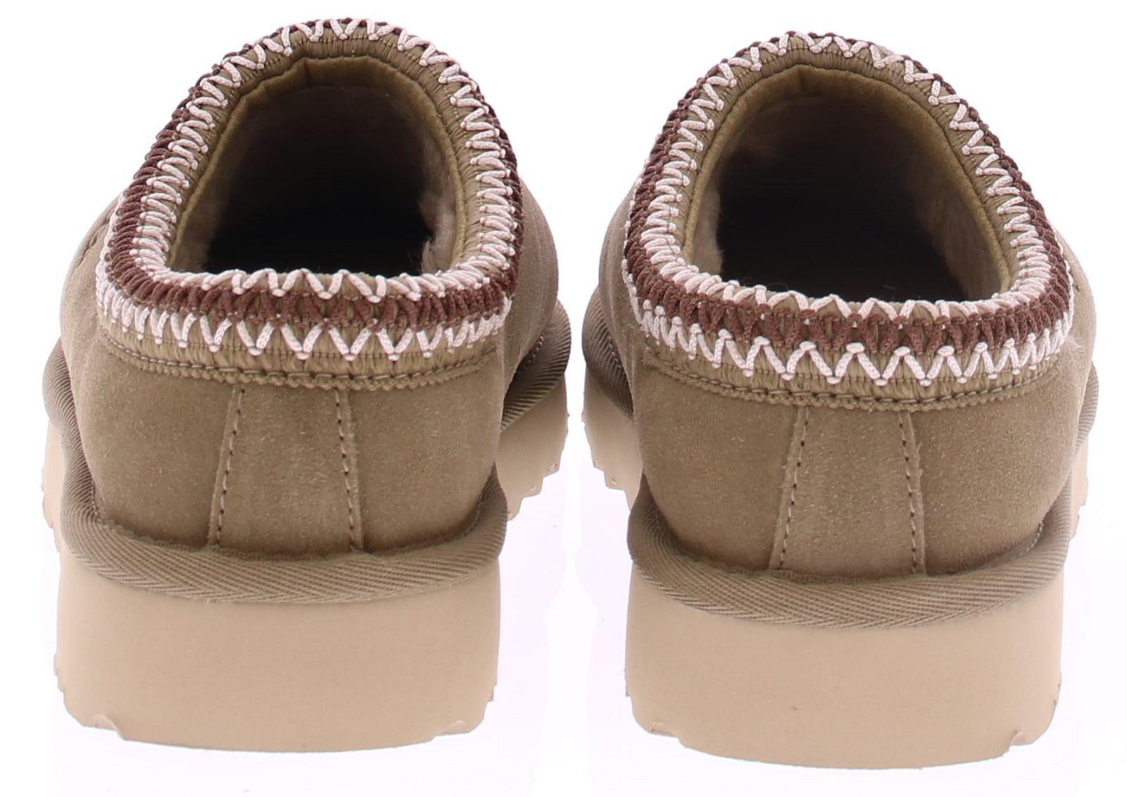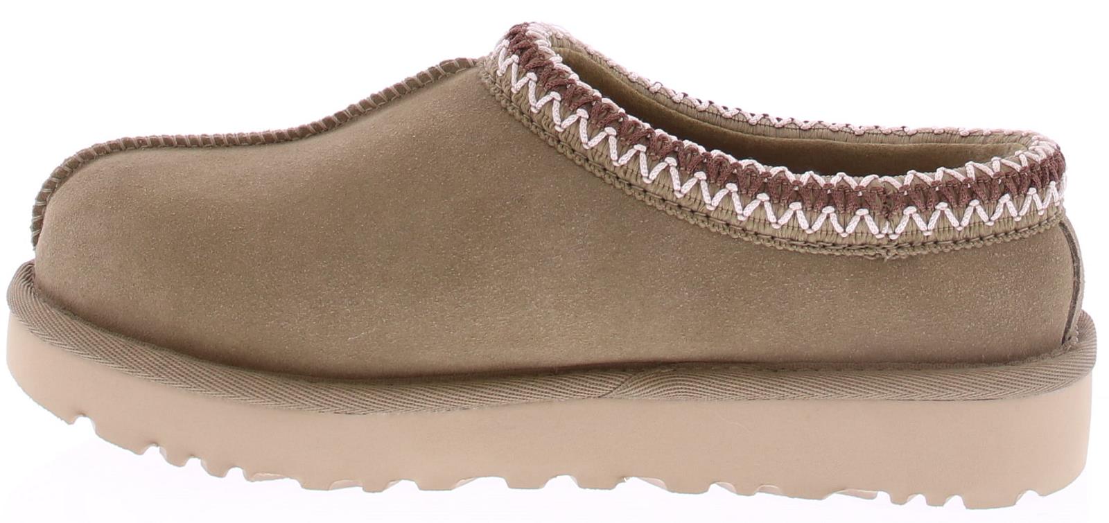 Khaki suede dames muil van Ugg. Deze Tasman heeft lichte zool. Langs de instap zit een geborduurde rand in dark brown met off-white. De voering is net zoals bij andere Ugg's gemaakt van aangename schapenvacht. Aan de zijkant van de wreef zit het Ugg logo gedrukt.