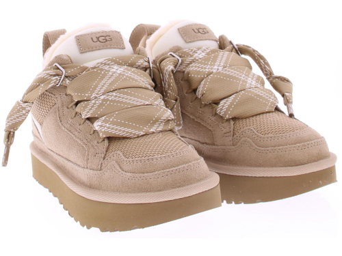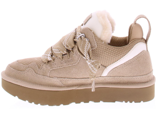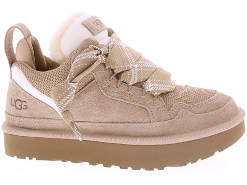 Zandkleurig suede dames sneaker/ boot van Ugg. De Lowmel sand is een lage sneaker met stoere brede veter en is vacht gevoerd. Het grootste gedeelte is suede en voorop zit mesh. Op de zijkant van de hiel zit het Ugg logo gedrukt
