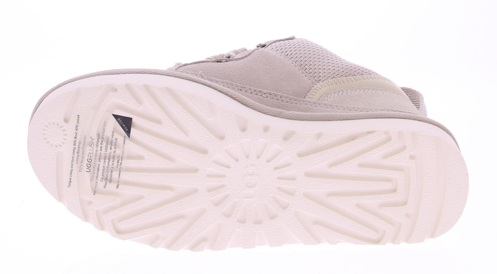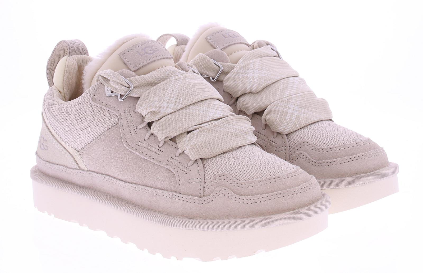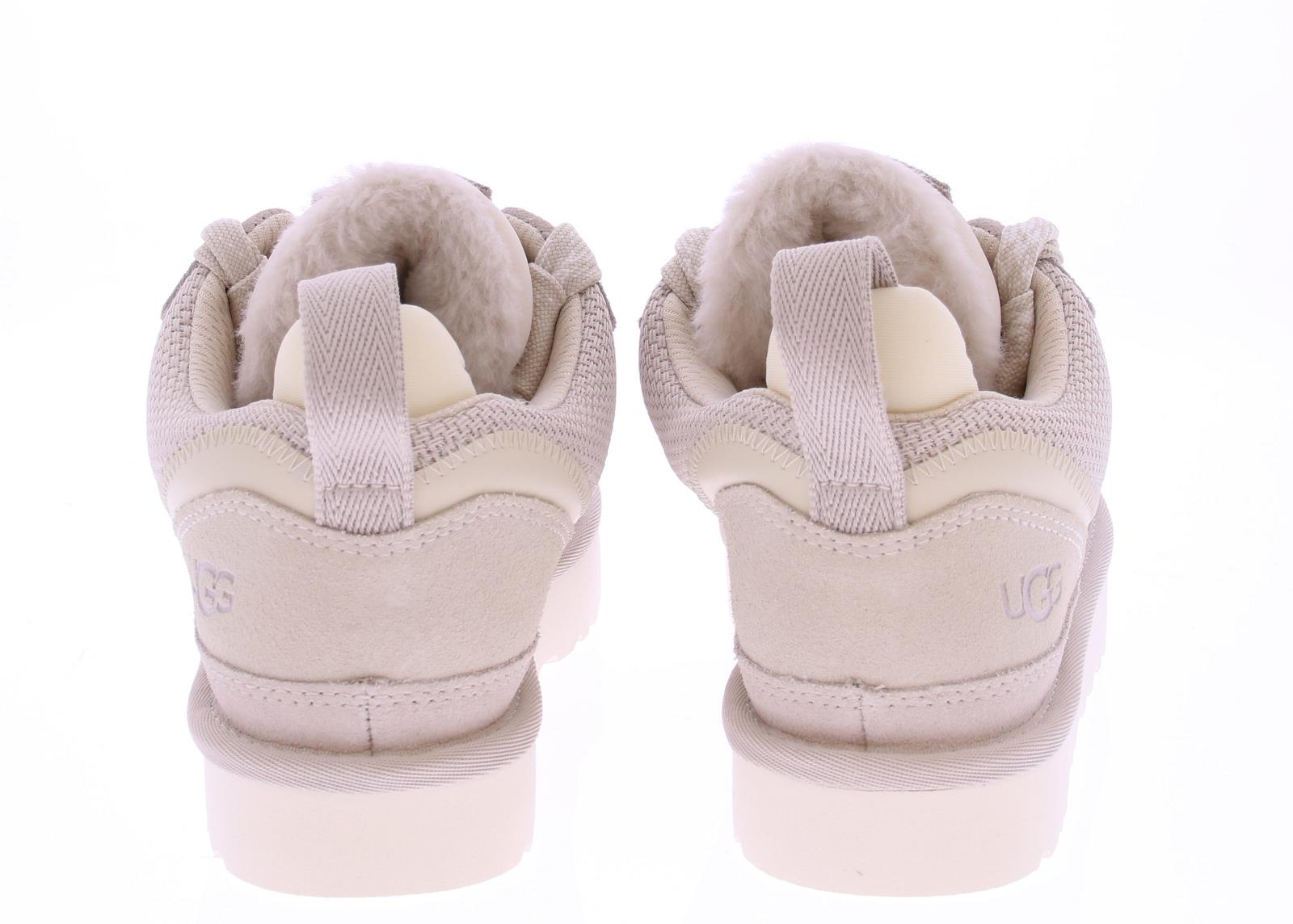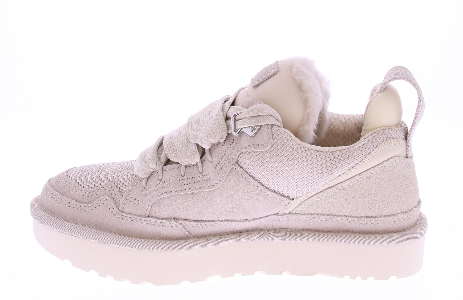 Off-white suede dames sneaker/ boot van Ugg. De Lowmel chestnut is een lage sneaker met stoere brede veter en is vacht gevoerd. Het grootste gedeelte is suede en voorop zit mesh. Op de zijkant van de hiel zit het Ugg logo gedrukt.