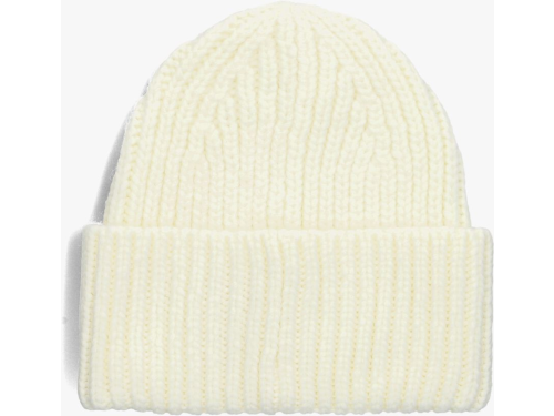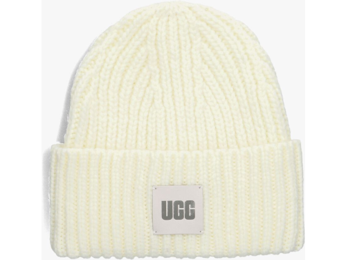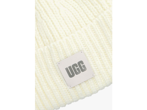 Roomkleurige dames muts van Ugg. De artikel naam van deze muts is 'Chunky Rib Beanie Nimbus'. De muts is half omgeslagen met het logo van Ugg voorop. De muts kan ook gedragen worden als beanie.