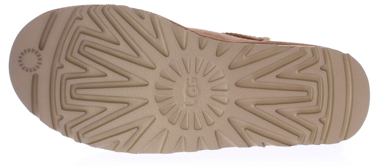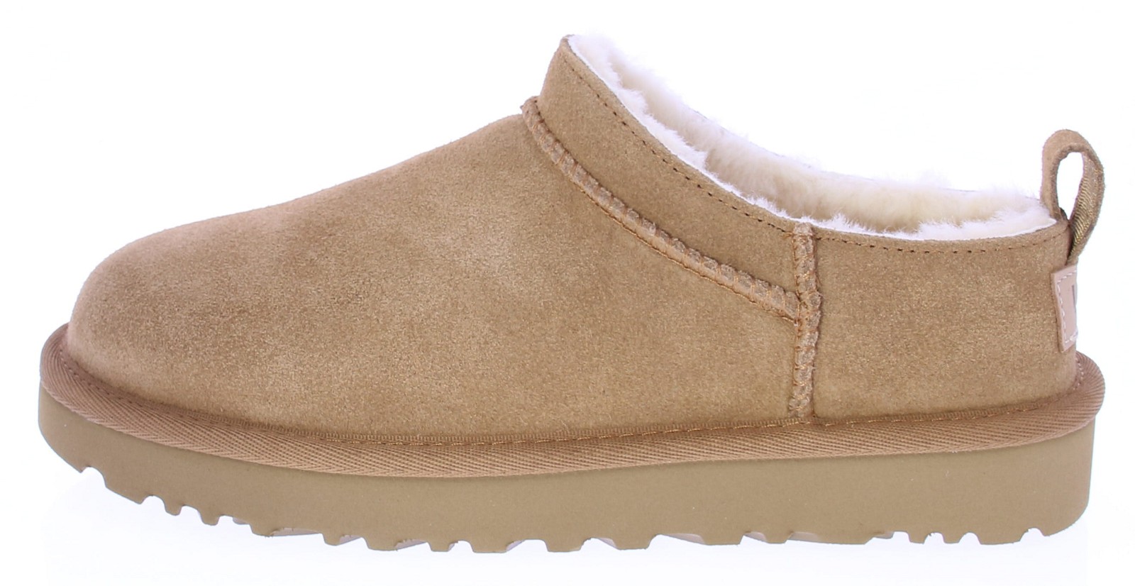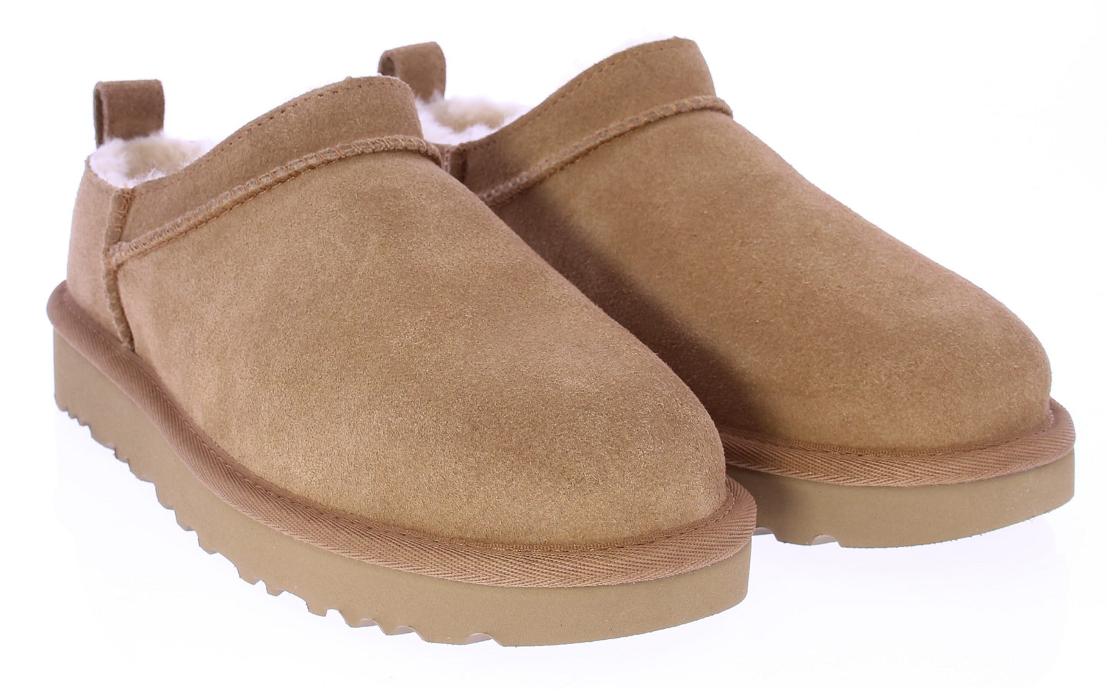 Chesnut suède classic micro voor dames van Ugg. Deze Classic Micro is een nieuwe interpretatie van onze populaire Classic-laars met een nieuw design met laag profiel (en hoogwaardig comfort). Het bovenstuk is gemaakt van echt suède en gevoerd met superzachte sheepskin die op natuurlijke wijze de temperatuur reguleert, zodat je ze met of zonder sokken kunt dragen. De lichtgewicht buitenzool van EVA op basis van suikerriet biedt moeiteloze ondersteuning en geeft je dat comfortabele pantoffelgevoel bij elke buitenactiviteit.