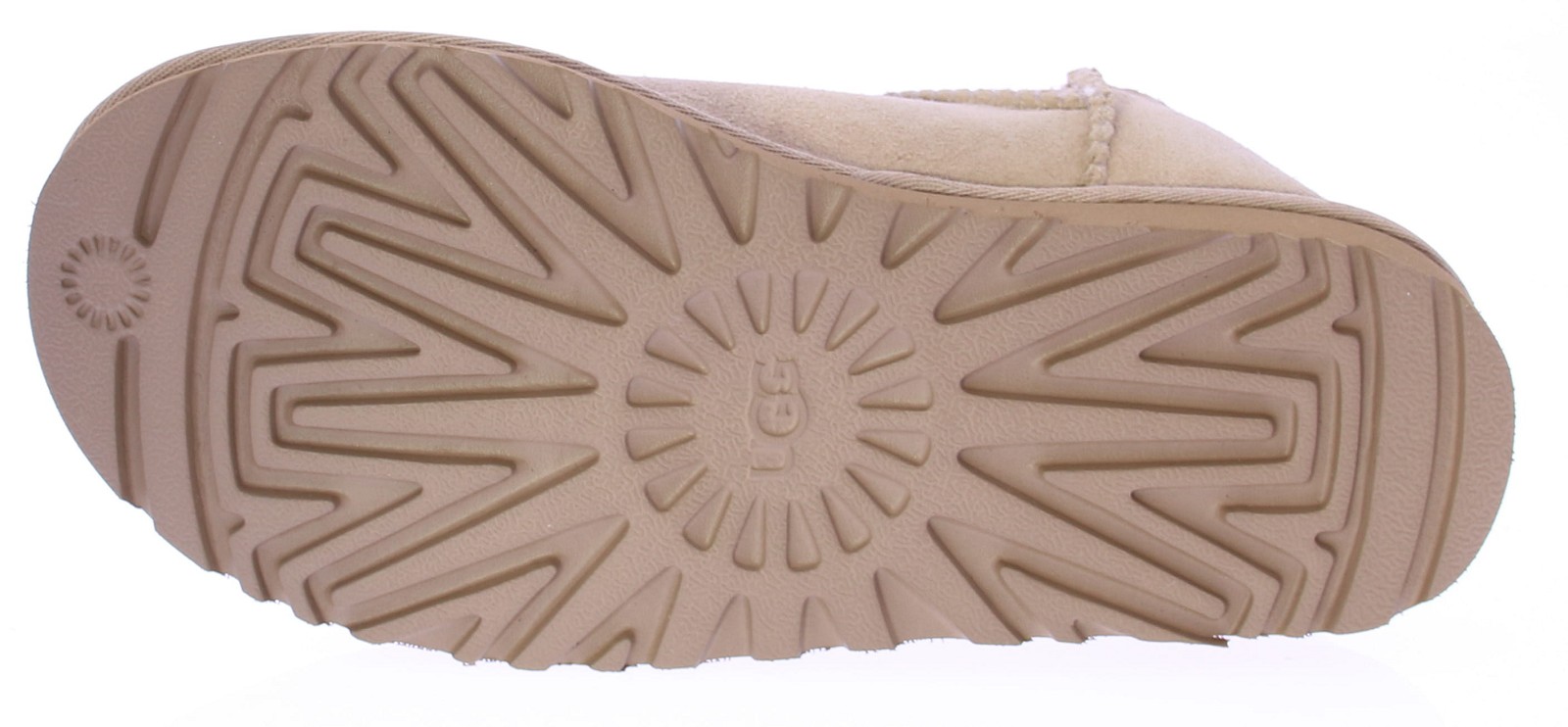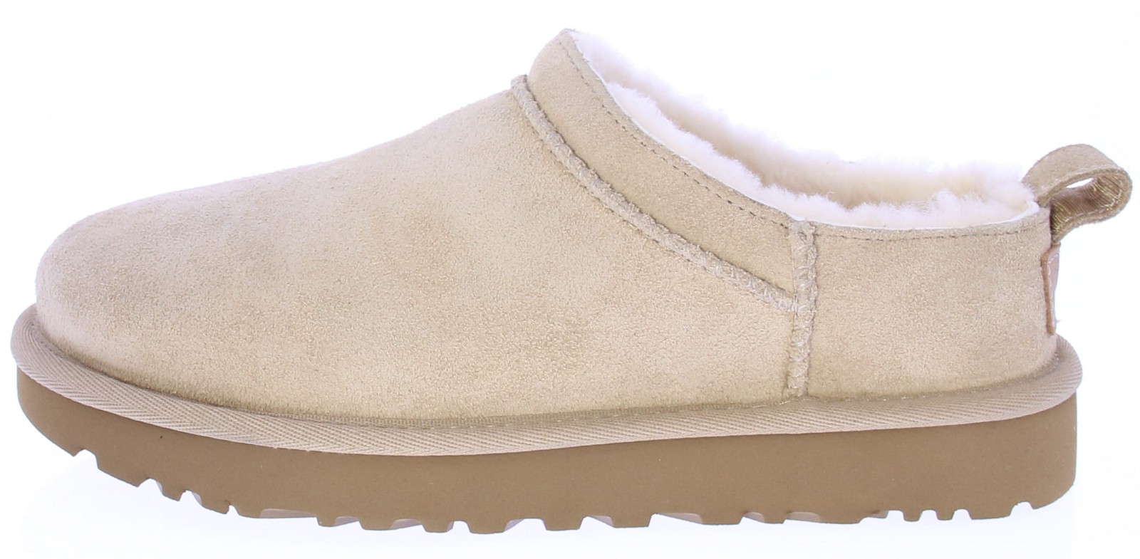 Zandkleurig suéde classic micro voor dames van Ugg. Deze Classic Micro is een nieuwe interpretatie van onze populaire Classic-laars met een nieuw design met laag profiel (en hoogwaardig comfort). Het bovenstuk is gemaakt van echt suède en gevoerd met superzachte sheepskin die op natuurlijke wijze de temperatuur reguleert, zodat je ze met of zonder sokken kunt dragen. De lichtgewicht buitenzool van EVA op basis van suikerriet biedt moeiteloze ondersteuning en geeft je dat comfortabele pantoffelgevoel bij elke buitenactiviteit.