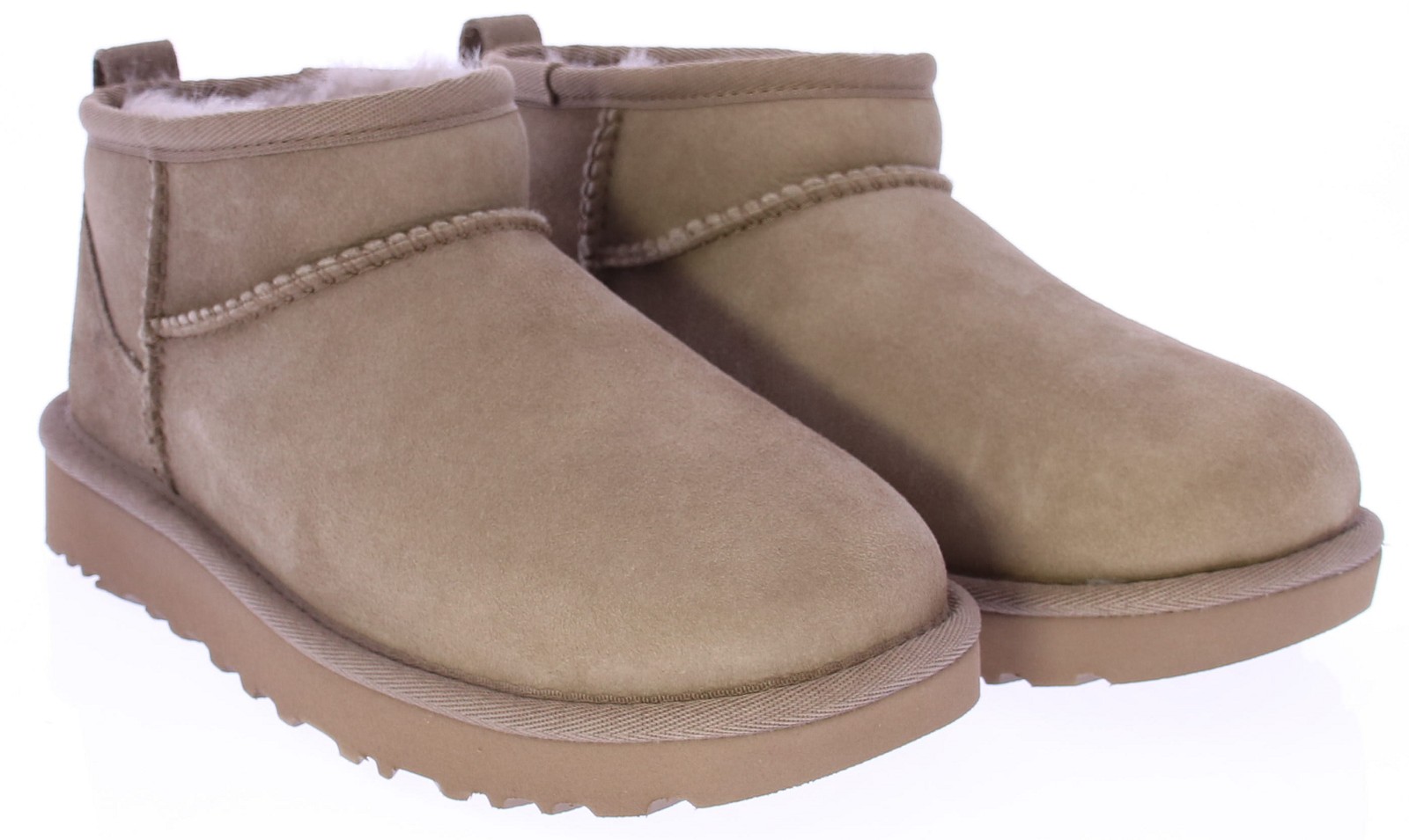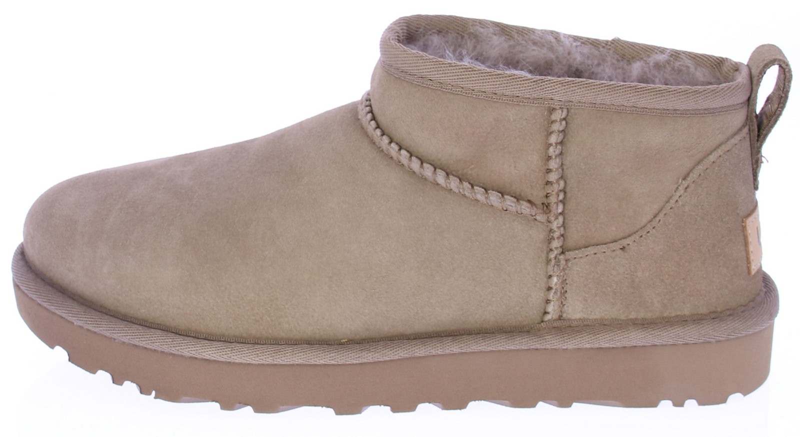 Taupe suede dames classic ultra mini van Ugg. Dit model is aan de buitenkant vervaardigd uit suede en voorbehandeld met vlek- en waterafstotende middelen. De binnenvoering is gemaakt van het welbekende schaapswol waardoor de voeten altijd verwarmd zijn. De treklus op de achterbies helpt het aan- en uittrekken te versoepelen.