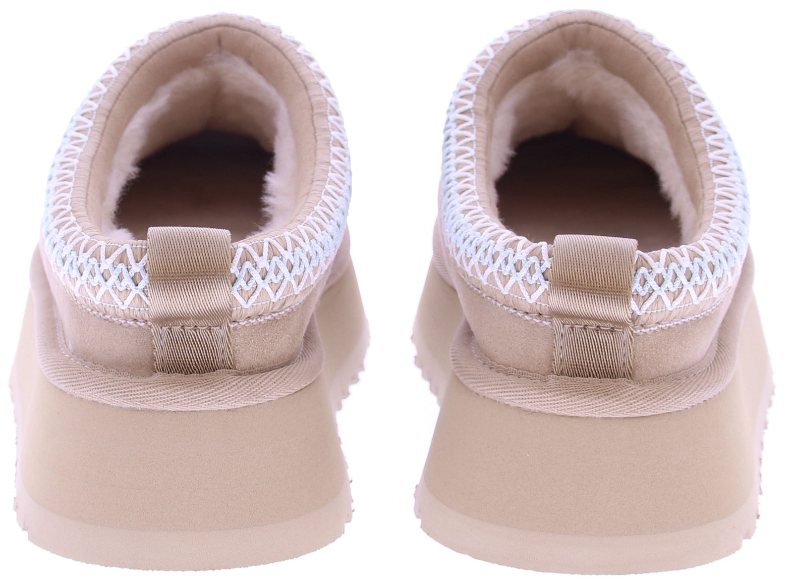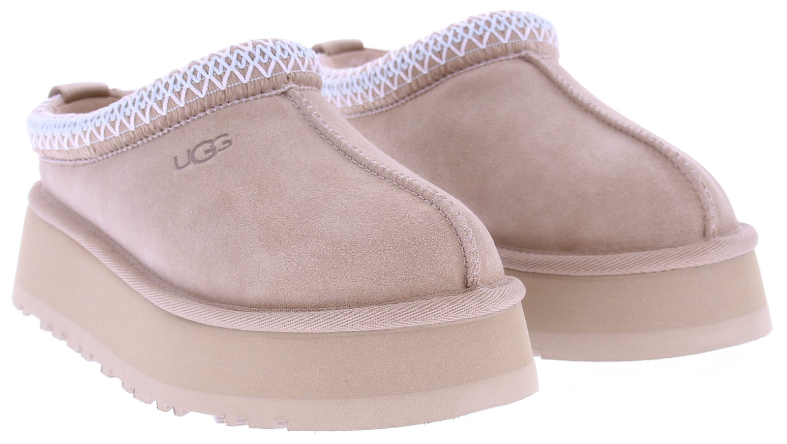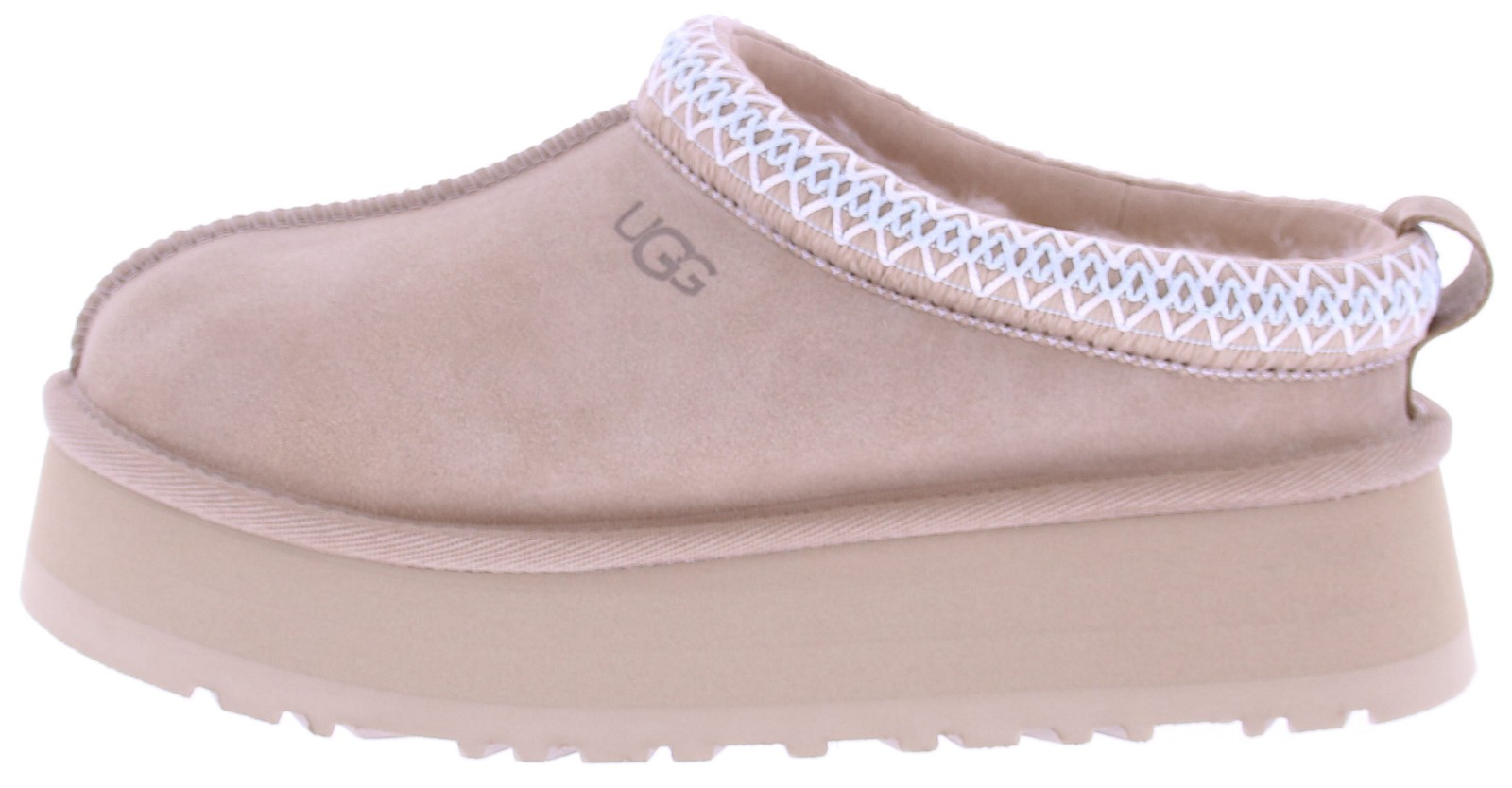 Zandkleurig suede dames muil van Ugg. Deze Tass sand II heeft een plateauzool. Langs de instap zit een geborduurde rand in lichtblauw met off-white. De voering is net zoals bij andere Ugg's gemaakt van aangename schapenvacht. Aan de zijkant van de wreef zit het Ugg logo gedrukt.
