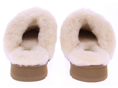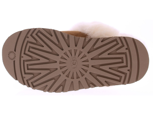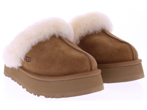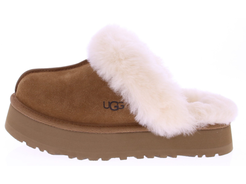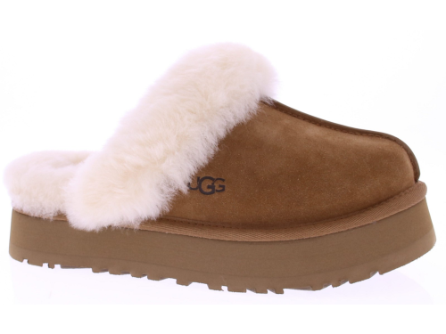 Chestnut suéde dames pantoffel van Ugg. De Ugg Disquette is een pantoffel met een plateauzool van 2,5 cm. Gemaakt van suède en zachte sheepskin, biedt deze slipper comfort en stijl voor elke dag. De dempende zool – van suikerriet-EVA of Treadlite by UGG™ – maakt hem geschikt voor buitengebruik.