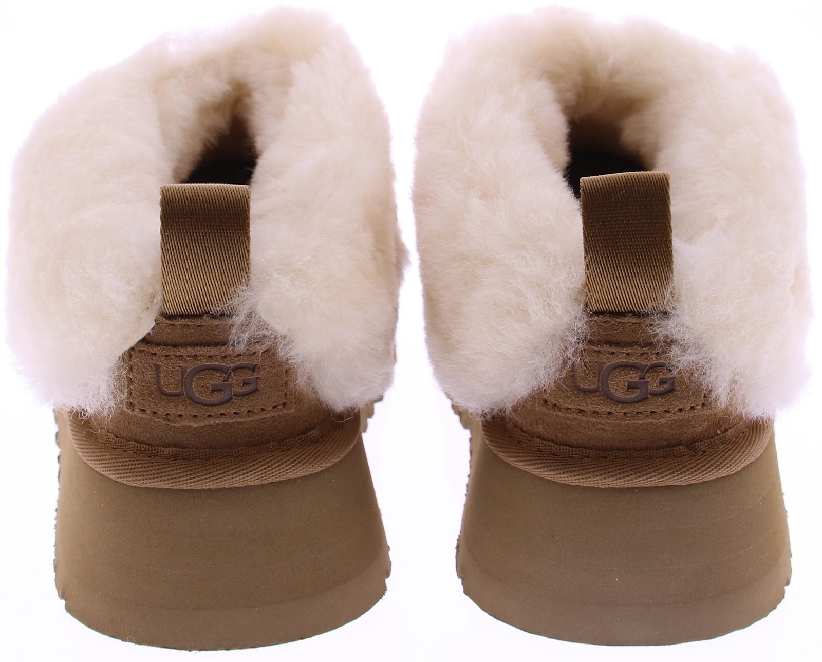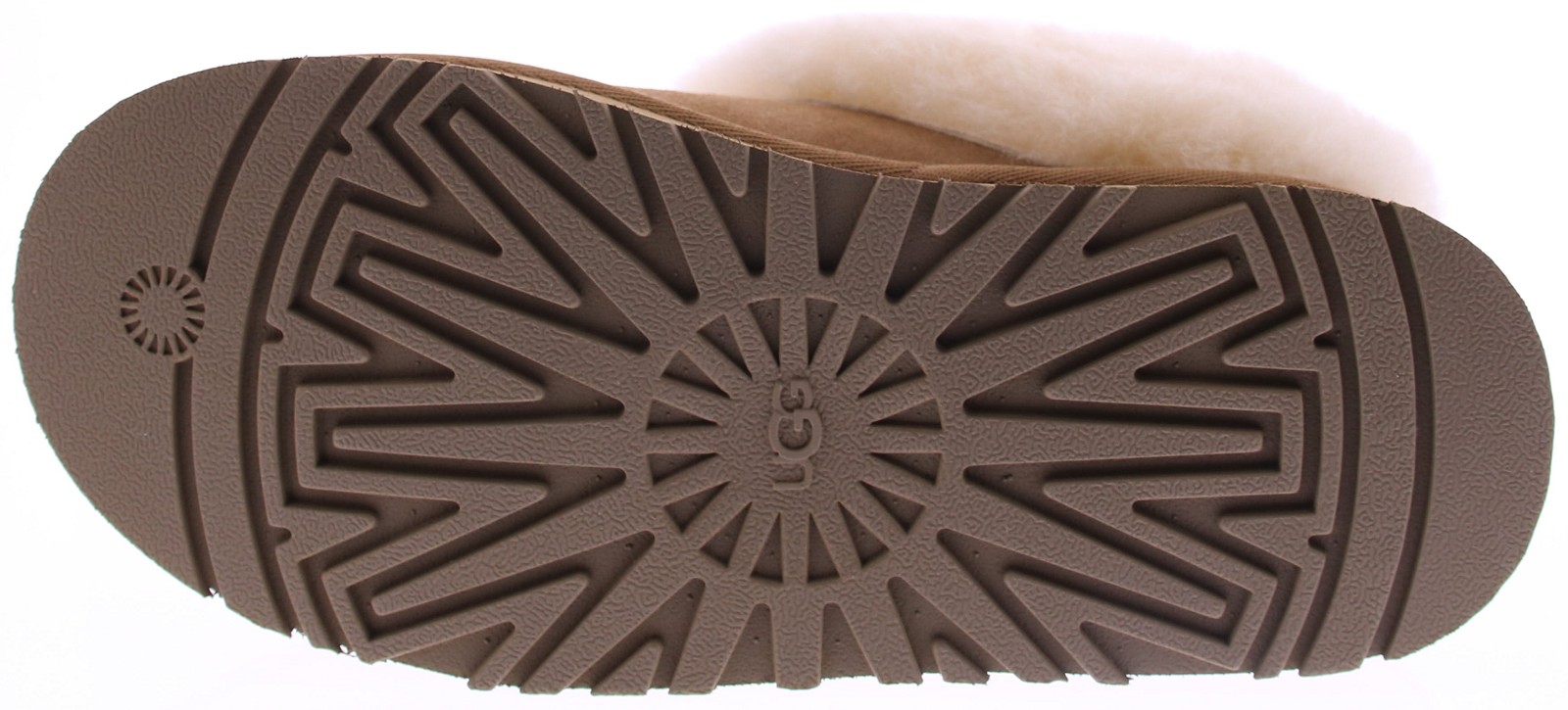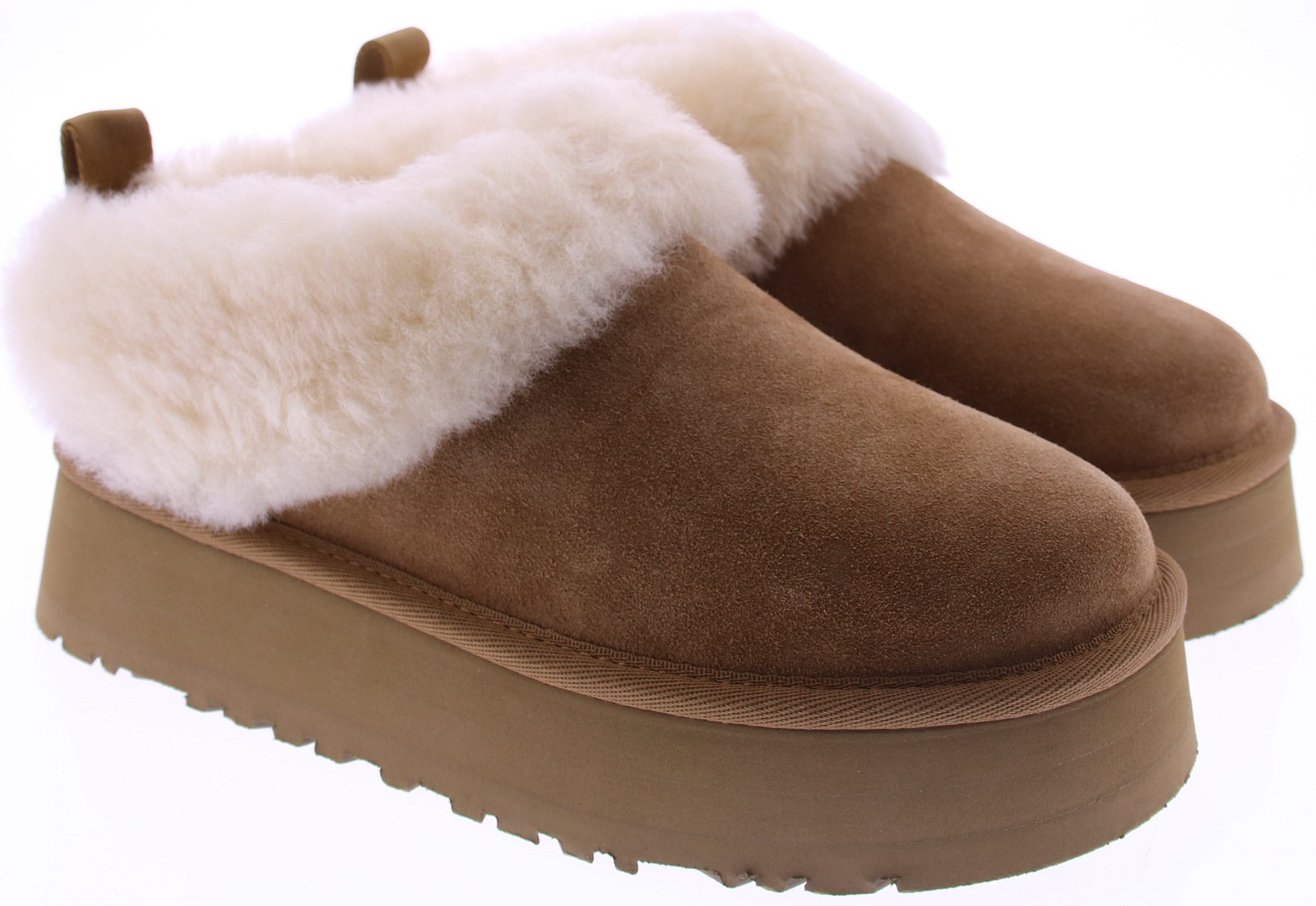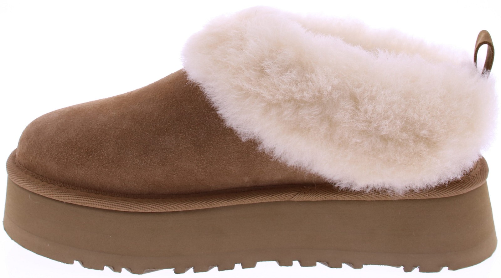 Chestnut suéde dames muil van Ugg. Deze Tazzelle heeft een plateauzool. Langs de instap zit een rand van schapenvacht. De voering is net zoals bij andere Ugg's gemaakt van aangename schapenvacht. Aan de zijkant van de wreef zit het Ugg logo gedrukt.