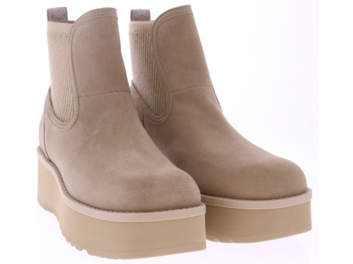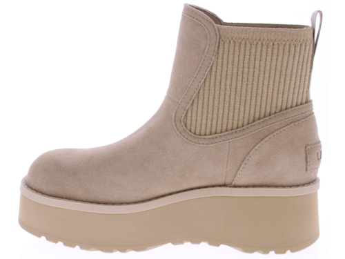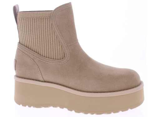 Zandkleurig suède dames korte laars van Ugg. Deze City func chelsea van Ugg is veelzijdig, capabel en heel comfortabel. Hij is voorzien van een opvallende plateauzool van 3,8 cm. De laars is gemaakt van waterafstotend suède om bescherming te bieden tegen onverwachte buien en beschikt over een ribgebreid bovenstuk voor een behaaglijke, gestructureerde afwerking. Dankzij de veerkrachtige middenzool van EVA op basis van suikerriet en de lichtgewicht rubberen buitenzool loop je er altijd funky bij, waar de dag je ook brengt.