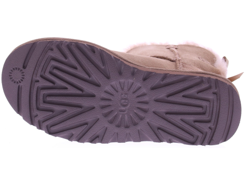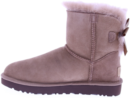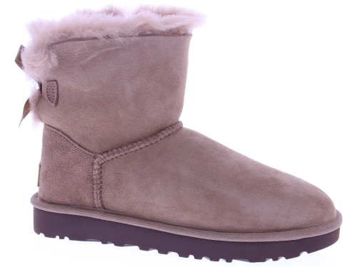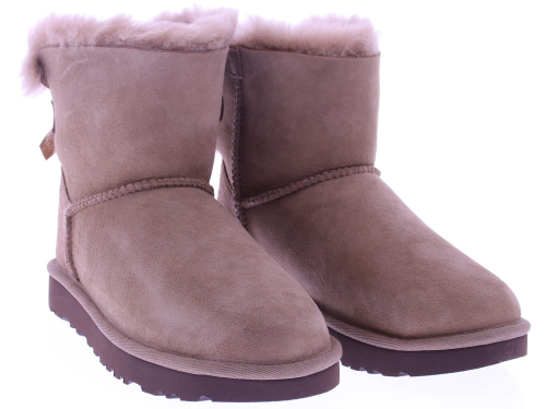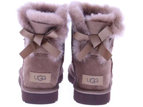 Middenbruin suède dames korte laars van Ugg. Deze mini Bailey Bow heeft een zijdezachte strik aan de achterkant. Deze laars met zachte sheepskin heeft twee nieuwe updates gekregen: hij is voorbehandeld tegen water en heeft onze lichtgewicht zool voor meer demping, stevigheid en grip. De stijl past vrijwel overal bij, van sportief tot soepelvallende jurkjes. De schachthoogte is 14 cm.