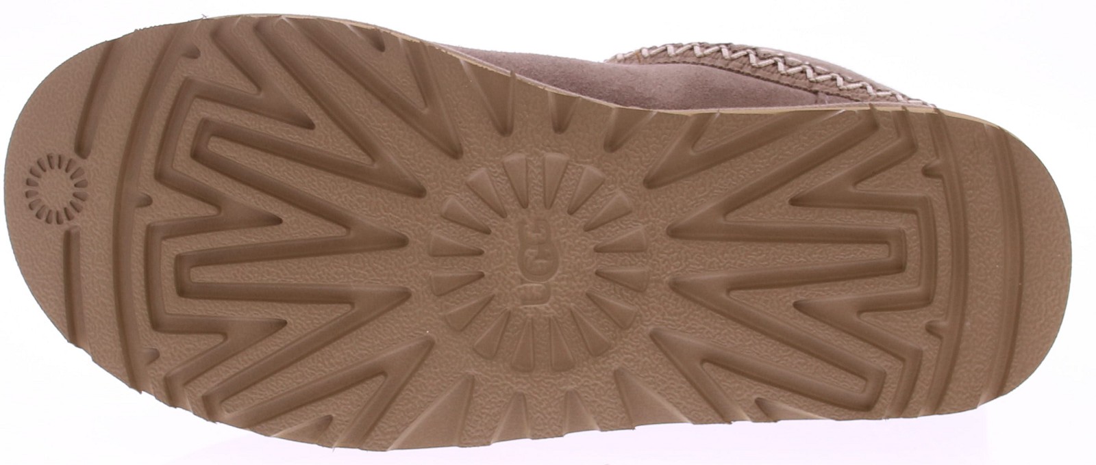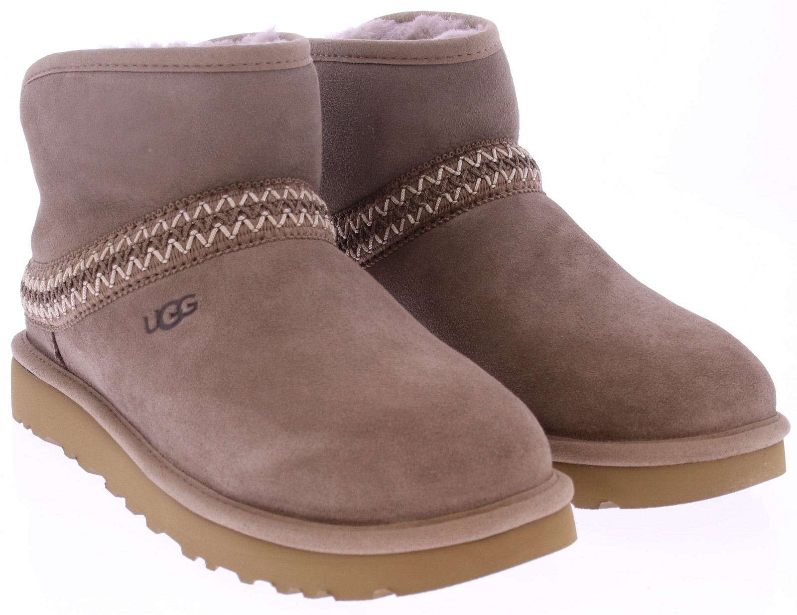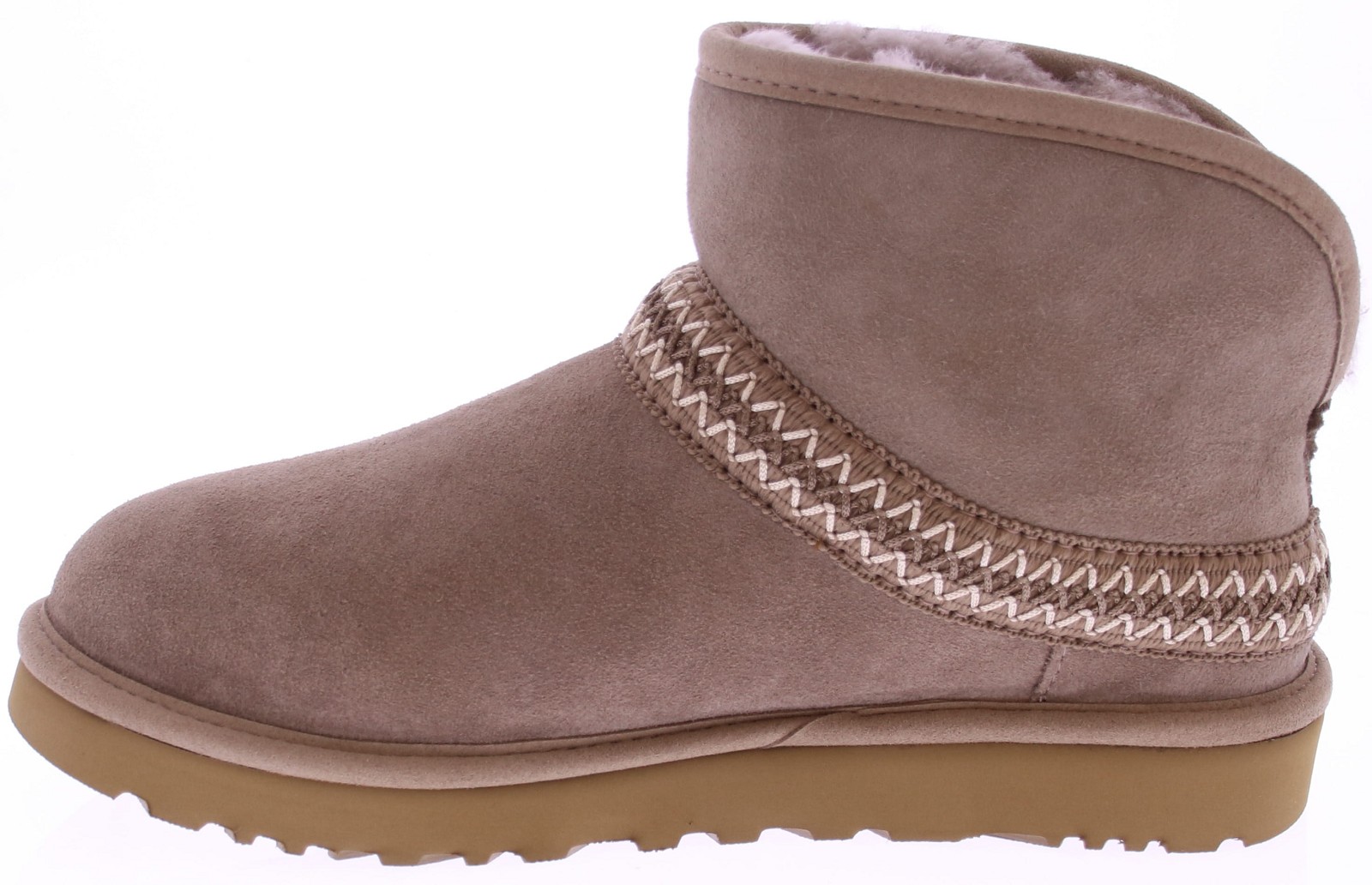 Taupe suède dames korte laars van Ugg. De Classic Mini Crescent heeft een gebogen schacht en kan worden omgevouwen om de luxe UGGplush-voering te laten zien, terwijl het UGGbraid een leuk detail aan de buitenkant is. De Classic Mini Crescent is comfortabel en behaaglijk, terwijl hij door de EVA-buitenzool van suikerriet tegelijkertijd uiterst licht is. Licht, warm en comfortabel uitstekend geschikt voor elke dag!